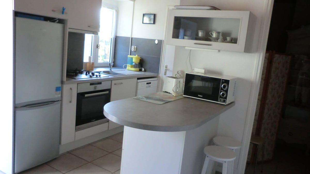 Independent apartment ng 75 m2, sa ground floor ng isang residential house, na binubuo ng isang living room/living room ng 45 m2, isang silid - tulugan na may shower room, toilet, fitted at equipped kitchen. Ang isang panlabas na terrace ay magbibigay - daan sa iyo upang tamasahin ang isang berdeng setting na matatagpuan malapit sa mga espasyo sa baybayin at kagubatan. Matatagpuan ang maaliwalas na pugad na ito 2 km mula sa mga tindahan at 250 metro mula sa daungan ng Kerascoët. May perpektong kinalalagyan sa pagitan ng Brest at Quimper, mabilis mong maa - access ang mga kapansin - pansing Finisterian site.