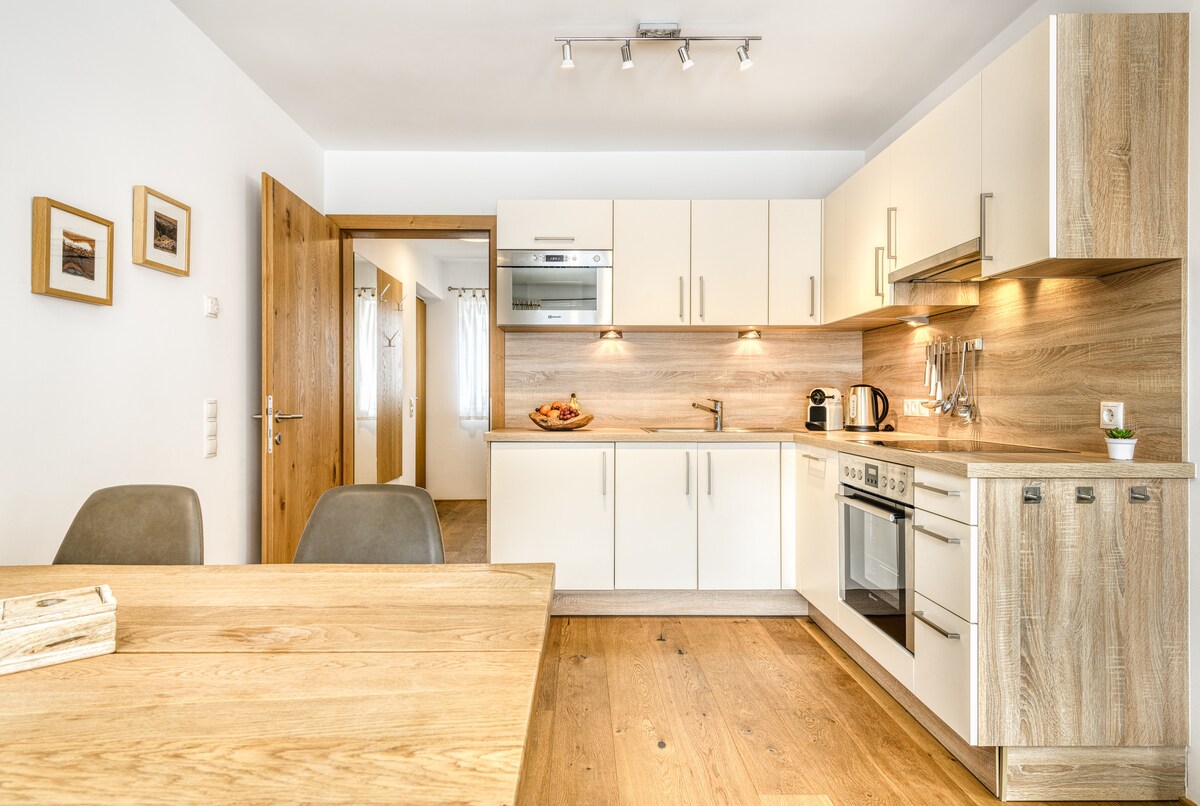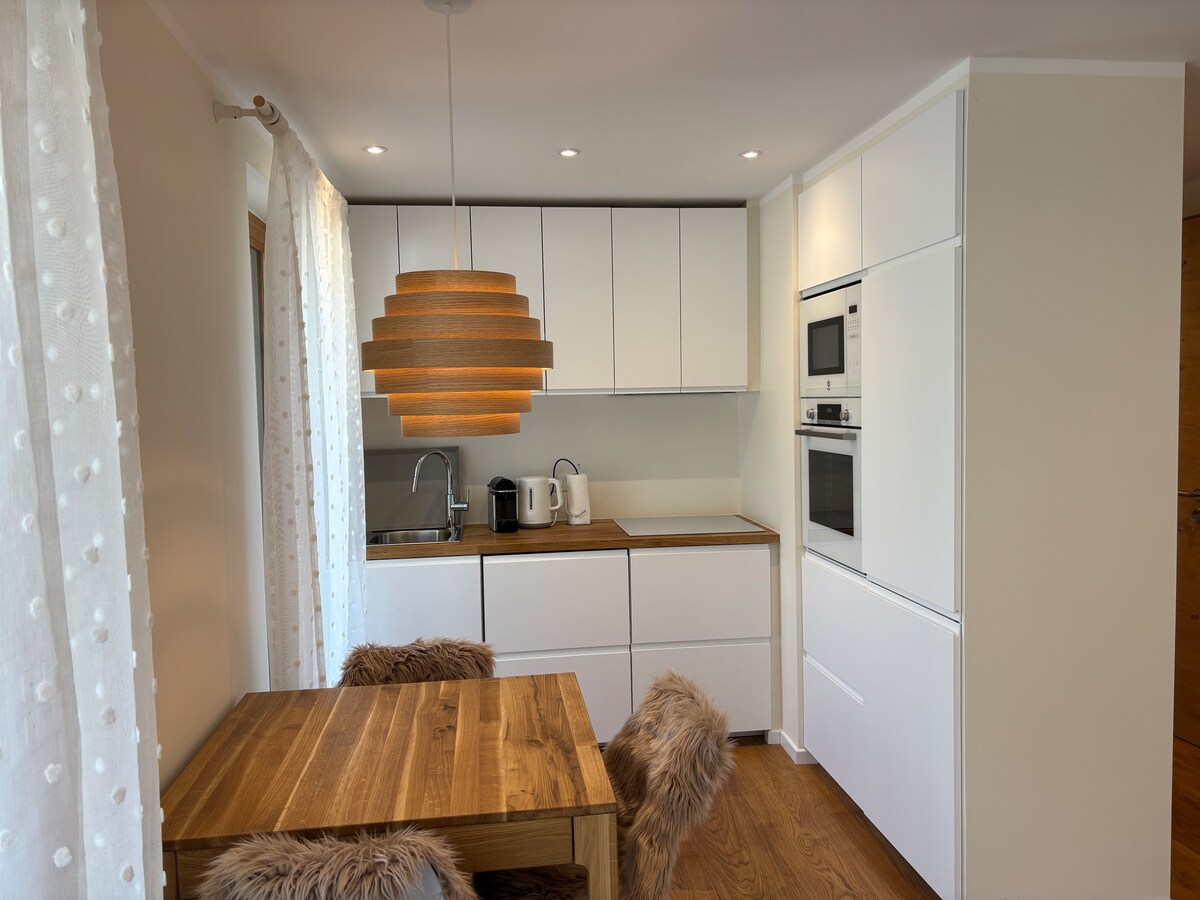Mga kamangha - manghang tuluyan sa modernong estilo ng alpine. Living space na may disenyo ng kusina, hiwalay na silid - tulugan at Comfort Deluxe banyo. Pribadong balkonahe na may tanawin ng bundok, libreng paradahan at walang kontak na pag - check in/pag - check out. Malugod na tinatanggap ang mga alagang hayop sa aming mga tuluyan para sa EUR 15.00 kada alagang hayop/gabi ayon sa naunang pag - aayos.