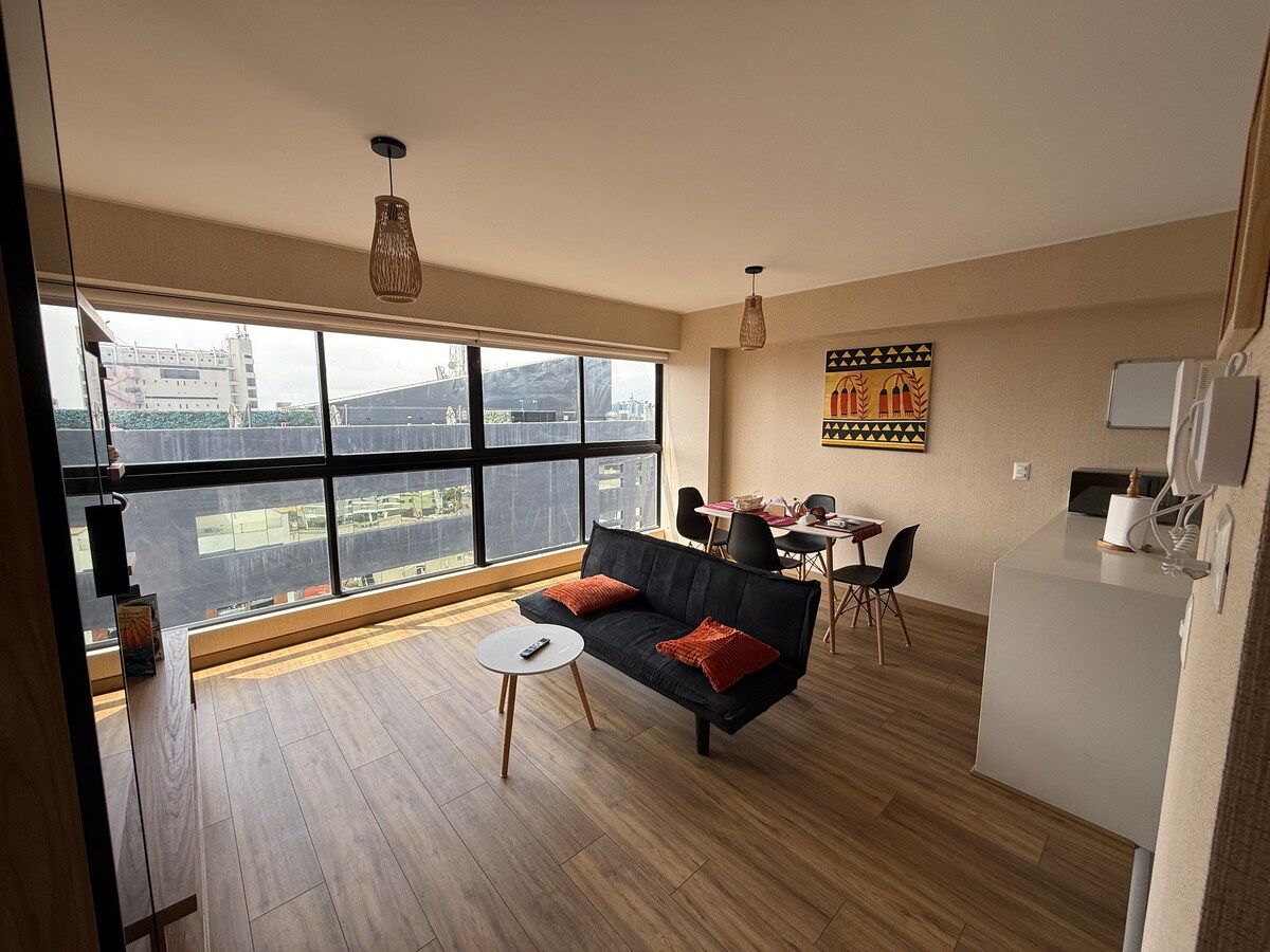 Matatagpuan sa tourist damero de Miraflores, 5 minutong lakad papunta sa mga lugar ng turista tulad ng Parque Kennedy at Larco Mar, 1 min mula sa istasyon ng bus, malapit sa mga supermarket, convenience store at restawran. Sobrang komportable, maluwag, maliwanag at komportable. Queen bed with first line mattress to make your rest enjoyable, 2 plz sofa bed, fully equipped kitchen, hot water, washing machine, 65 ”TV. Gusaling may inihaw na lugar, campfire, katrabaho at gym. Ligtas na lugar.