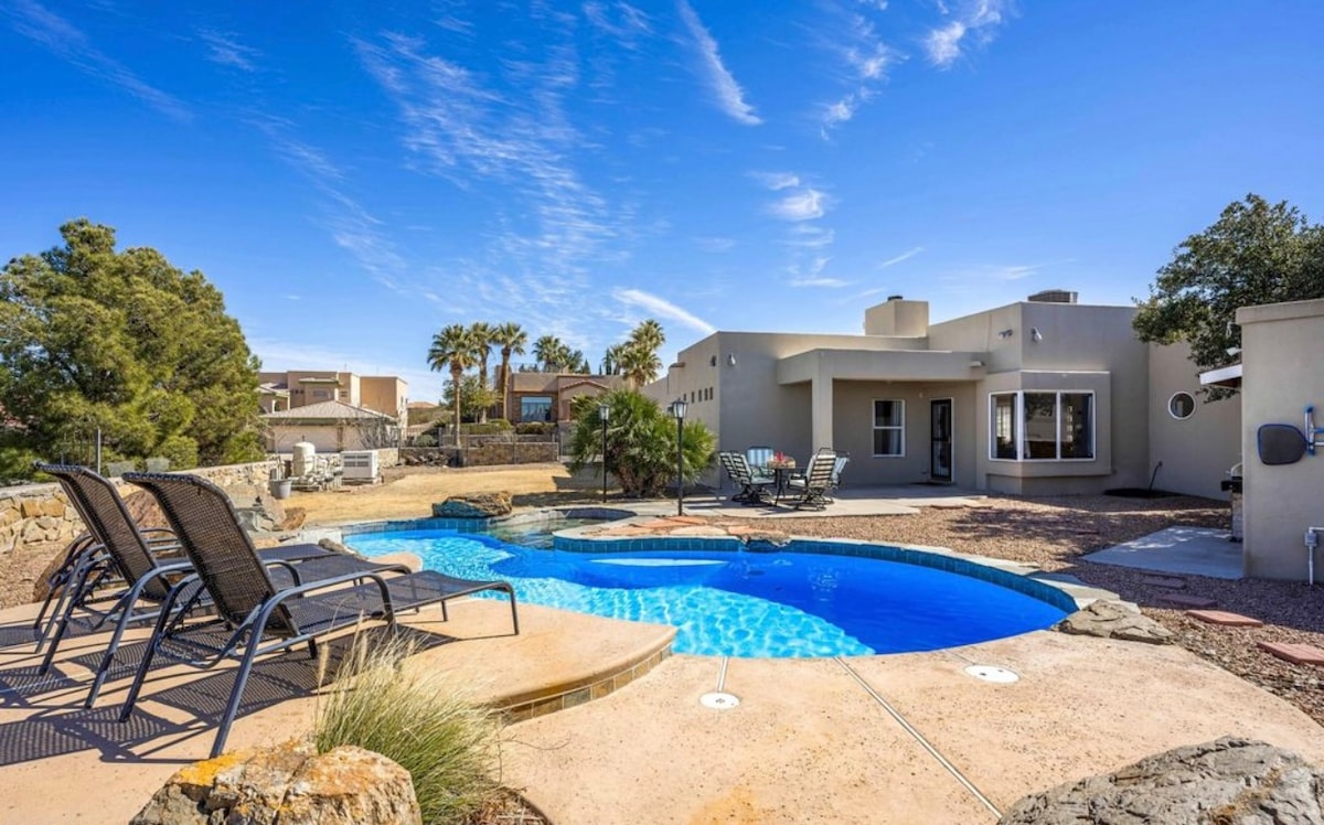 Makaranas ng marangyang pamumuhay sa isa sa mga pinaka - upscale at kanais - nais na kapitbahayan sa Las Cruces. Ilang segundo ang layo mula sa Sonoma Ranch golf course at Country Club. Masisiyahan ka sa mahiwagang paglubog ng araw habang lumalangoy sa aming buong taon na pinainit na pool. Malaki at ganap na nakapaloob na bakuran para sa privacy at mga alagang hayop. Kumpleto sa mga laro at ping pong table. Available ang stand - alone na Casita nang may karagdagang bayarin, kabilang ang hiwalay na climate control TV at queen - sized na sofa sleeper (walang banyo sa casita). Naghihintay angacation!