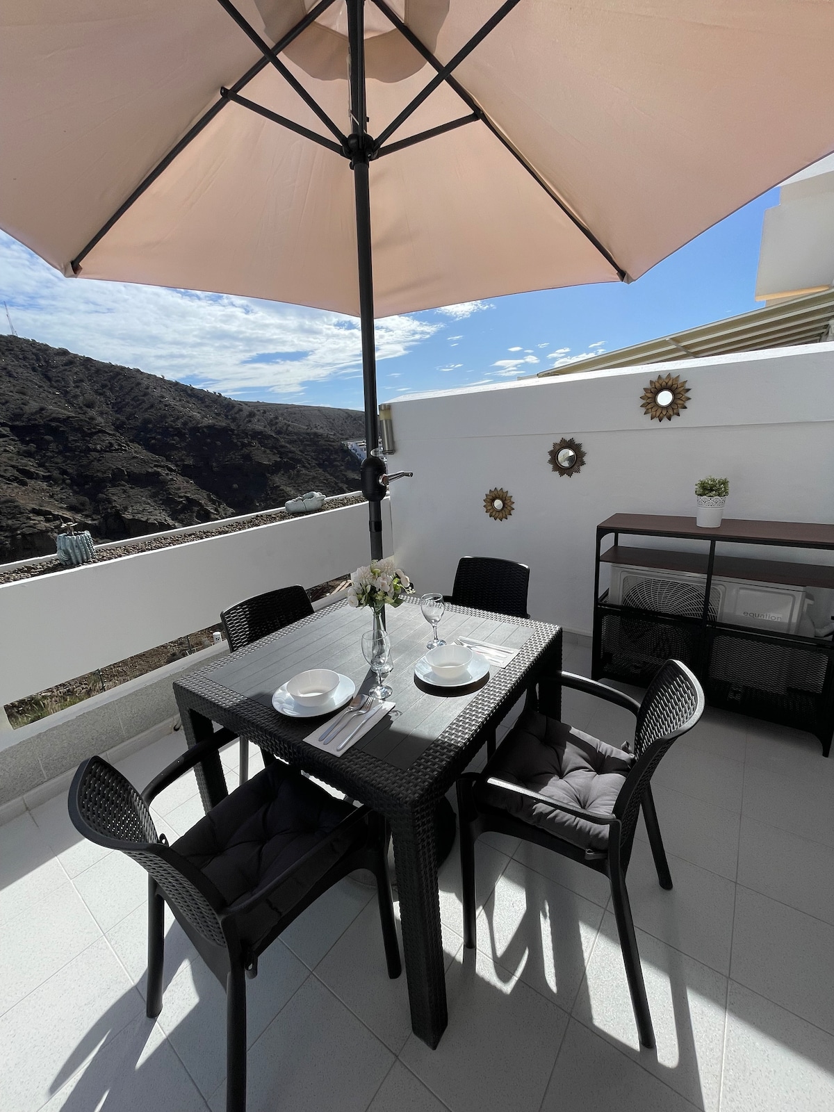 Magandang bagong apartment sa isang villa na may sarili mong asin‑asin na swimming pool sa labas mismo (Walang kemikal) ng pinto ng terrace mo. Perpekto para sa home office, 2 desk na may mga upuang pang-opisina. Bawal manigarilyo, sa loob man o sa terrace! Matatagpuan 15 minutong lakad papunta sa maaraw at kaakit - akit na dating fishing - village na Arguineguin, na may beach, mga lokal na bar at restawran sa tabi ng dagat. Kilala ito dahil sa pinakamagandang klima sa mundo. Posibleng magrenta ng portable aircon para sa mainit na araw ng tag-init, sa halagang 9 Euro kada araw. ( Tingnan ang mga bayarin sa pamamahala).