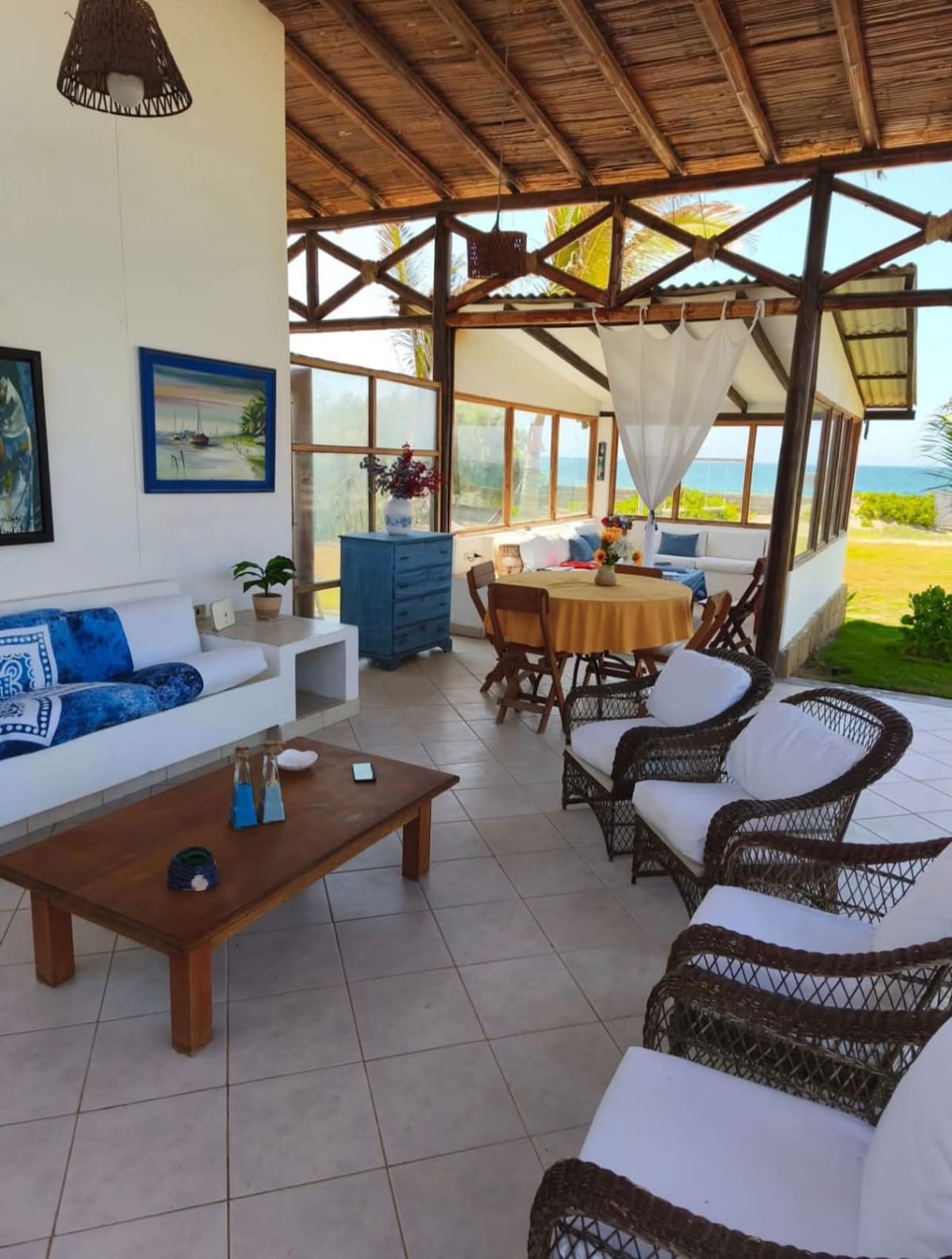 Perpektong lugar para sa mga kaibigan at pamilya. Nakatuon ang bukas na disenyo ng aming tuluyan sa tabing‑dagat sa karagatan, beach, at kalangitan. Ang malalaking bintana at mataas na kisame ay lumilikha ng isang maaliwalas, cool na interior at isang lilim na panlabas na sala na nakatanaw sa pool, deck, hardin at karagatan. Dito maaari mong gawin ang kaunti o hangga 't gusto mo sa araw o lilim. Napakaganda ng mga paglubog ng araw at nakakabighani ang mga gabi. Nagbibigay ang mga ilaw sa pool ng magandang tanawin sa patyo, at nakakahikayat ang bar at silid-kainan na magtipon ang mga bisita.