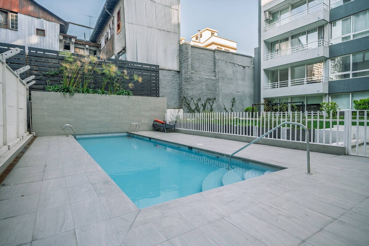 Mag-enjoy sa apartment na ito na may 1 kuwarto at sofa bed na malapit sa lahat: mga pangunahing kalye, transportasyon (mga bus at metro), mga lugar ng turista, mga bohemian na kapitbahayan (Lastarria, Barrio Italia), mga ospital, mga plaza, at mga parke. Mainam para sa mga pananatiling walang inaalala: magiging komportable ka dahil kumpleto ang lahat ng kailangan mo. Dahil nakaharap ito sa timog, malamig dito sa tag-araw kahit walang aircon at walang ingay sa labas! Makakapagpahinga ka nang payapa dahil sa mga thermopanel na bintana. Magdagdag ng almusal kung gusto mo!