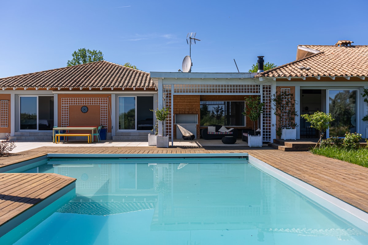 Isama ang iyong sarili sa tunay na karanasan sa kaginhawaan sa marangyang, ganap na naka - air condition na villa na 300m2 na ito, na matatagpuan sa gitna ng mga kaakit - akit na lambak ng pagitan ng dalawang dagat sa isang kaakit - akit na condominium, 10 minuto mula sa Bordeaux. Nag - aalok ang villa na ito ng bukas - palad na tuluyan at walang kapantay na privacy para sa hindi malilimutang bakasyon para sa mga pamilya o grupo ng mga kaibigan. Panoramic view, 11m by 4m swimming pool, pétanque court, ang bahay na ito ay ang perpektong base para sa pagtuklas sa lugar at pagtuklas sa mga tagong yaman nito.