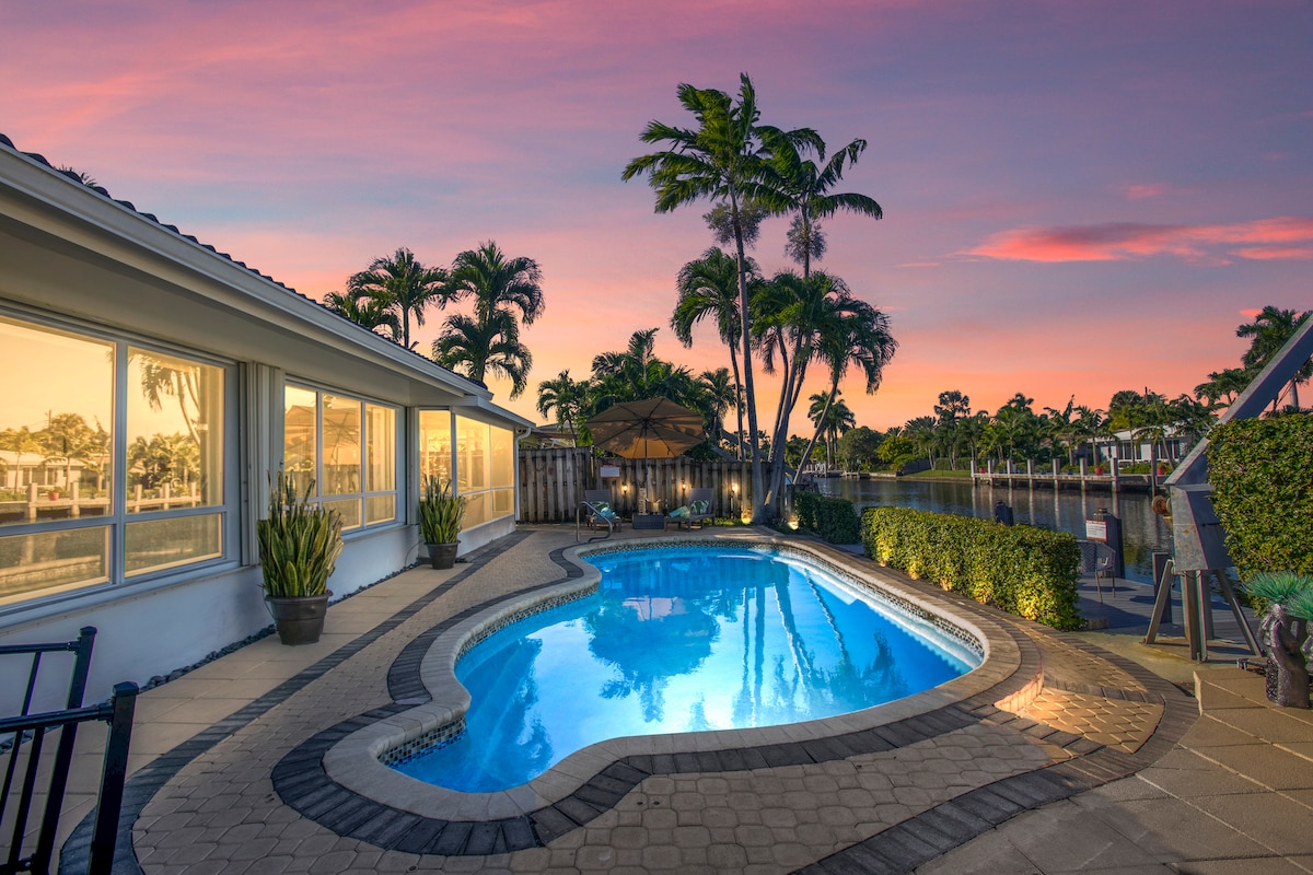 🌴Welcome sa bakasyunan mo sa tabi ng kanal! Mag-enjoy sa pool kasama ang pamilya, o mag‑inuman sa hot tub at sa bagong wet bar. 🍹May TV sa outdoor seating area namin 📺—perpekto para manood ng laro ng paborito mong team o panoorin ang pelikula kasama ang pamilya. 🍔🔥Magrelaks sa gazebo na may BBQ area, 💪🏋️♀️o mag‑ehersisyo sa outdoor gym. 🛌Maganda ang pamamalagi dahil sa mga komportableng kuwarto at dalawang inayos na banyo. Ilang minuto lang mula sa magagandang baybayin at kainan sa Pompano Beach! 🏖️