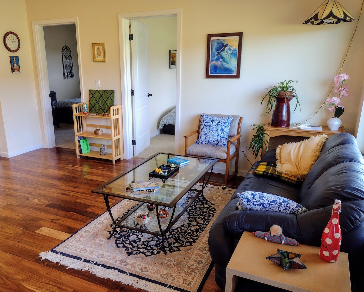 Pribadong pasukan papunta sa maliit na apartment na may isang kuwarto o guest suite. Stacked washer/gas dryer..refrigerator.. cooktop.. microwave..lahat ng kailangan mo para magluto o mag-ihaw ng pagkain. Habang nasa labas ka, tinatapon ko ang basura, kinokolekta ang mga recyclable, at inaayos ang kusina at banyo para sa iyo. Bumalik ka araw‑araw sa Malinis at tahimik na Tuluyan at magrelaks. Magpahinga sa hot tub o sauna o sa deck at magsaya sa kagandahan ng kalikasan at makinig sa mga tunog ng mga ibon at hayop sa paligid mo.