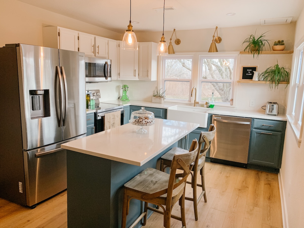 Itinayo noong 1910 na may likuran ng kamalig na itinayo sa parehong taon, komportable at tahimik ang The Farmhouse. Ang bahay ay na - update at may lahat ng mga modernong kaginhawaan habang pinapanatili ang isang kakaibang pakiramdam ng bansa sa gilid ng mga suburb. Maglakad sa mga trail ng kalikasan sa prairie center (1 min), bumisita sa KC Wine Co. (6 min.), mag - enjoy sa lawa (3 min drive) o pumunta sa lungsod. 30 minuto ang layo ng Downtown Kansas City. Available sa lugar ang mga 🔋BAGONG ⚡️LIBRENG EV Charging at may diskuwentong matutuluyang Tesla.