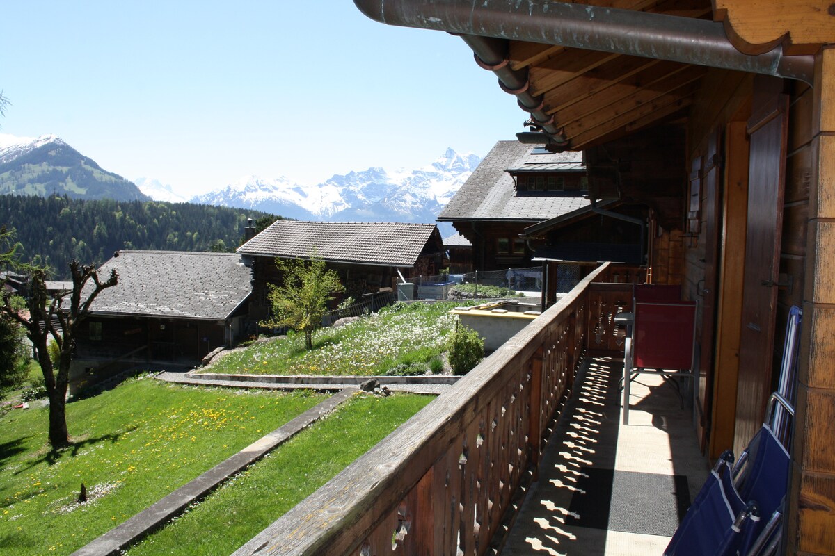 L'appartement fait partie de l'annexe érigée en 1950 au chalet paternel. Ce chalet a été construit en 1850 par mon arrière-grand-père, mes grands-parents y ont vécus et mon papa et sa soeur y sont nés. L'appartement a été rénové de peu, il est meublé simplement et fonctionnellement. Devant le chalet, il y a un terrain gazonné, qui a été longtemps le potager et la seule source de revenu pour ma grand-maman devenue veuve prématurément.