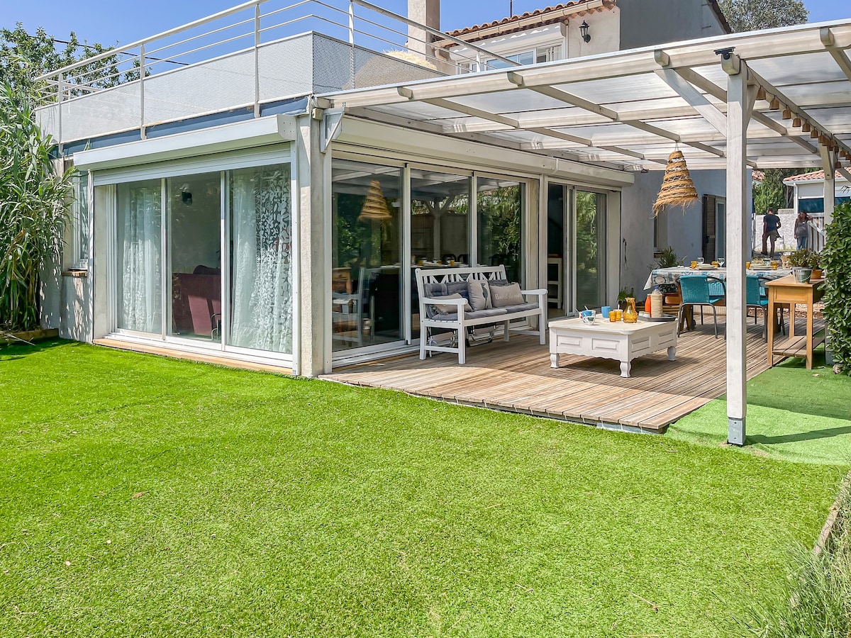 Magandang villa sa isang antas, bago, 500 M at 10 minutong lakad papunta sa dagat sa isang residensyal at tahimik na lugar. Makakakita ka ng hardin na may mga esensya sa Mediterranean at isang kahanga - hangang salt pool (7*3) + kasama ang 7*2 beach ( 40 cm na tubig) na perpekto para sa mga bata. 3 silid - tulugan na may mga aparador 2 banyo na may mga shower 2 wc Kusina na kumpleto ang kagamitan Pantry na may washing machine Sa loob ng paradahan ng villa