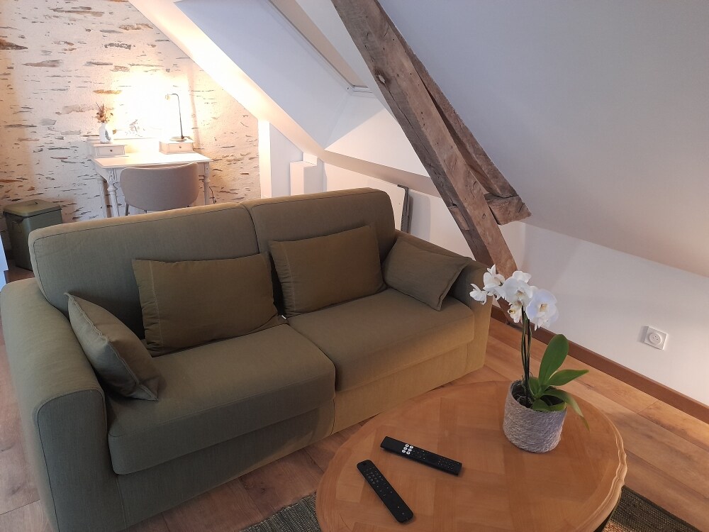 Duplex studio na 30m², sa pagpapatuloy ng aming bahay. Ang entry ay malaya. Sa ibabang palapag, may kusina na may kalan, refrigerator, kettle, ... 1 higaan para sa 2 tao (2 solong kutson), shower room + toilet. Isang double bed sa itaas na mapupuntahan ng hagdan. Mga kalan at heater na nasusunog sa kahoy Ang lugar sa labas: 20m² terrace 20 minuto mula sa Angers at Chateau - Gontier 5 minutong biyahe papunta sa Isle Briand Park (karera ng kabayo, Lion World Cup at paglalakad)