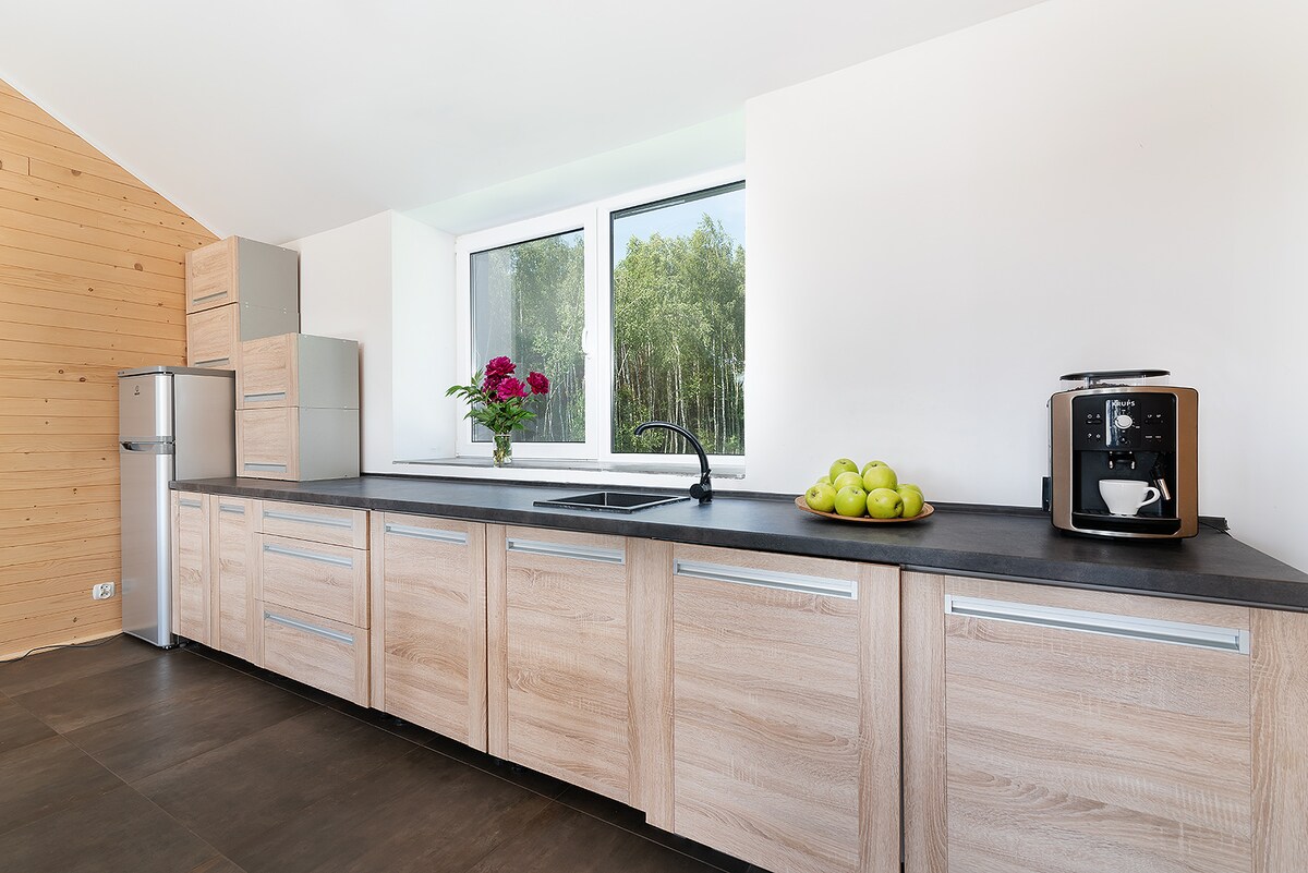Isipin mong magbukas ng bintana at damhin ang sariwang hangin, ang amoy ng kagubatan, ang lapit ng kalikasan. Binabawi mo ang kapayapaan, ritmo, pagkakaisa. Maligayang pagdating sa aming buong taon, komportable at komportableng tuluyan. Ang bahay ay matatagpuan sa isang magandang lugar - sa kakahuyan sa tabi ng lagoon (maaaring lakarin at maligo). Ginagarantiyahan namin ang mga sobrang atraksyon sa ilalim ng mga bituin - isang paliguan sa Russian bath - lalo na angkop para sa mga malalamig na gabi. Komportableng pagpapainit sa ilalim ng sahig.