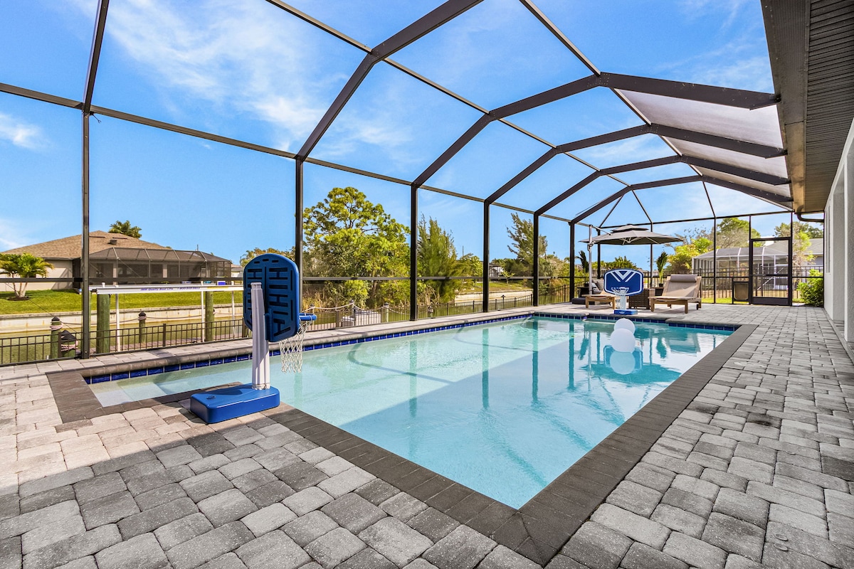 Escape to this stunning 5-bedroom, 4-bath villa on a scenic Cape Coral, Sleeps 12 with a private pool, hot tub, and dock—park your boat and spot dolphins and manatees in the canal. Enjoy a gym with bench, squat rack, and ping pong, and shuffle board. BBQ on the canal-view patio. Features 2 master suites, 3 kings, 1 queen, 2 twins. 10-min to Cape Coral Beach. Free parking and Wi-Fi. Perfect for families seeking a lavish spring getaway. Book now for an unforgettable waterfront escape!