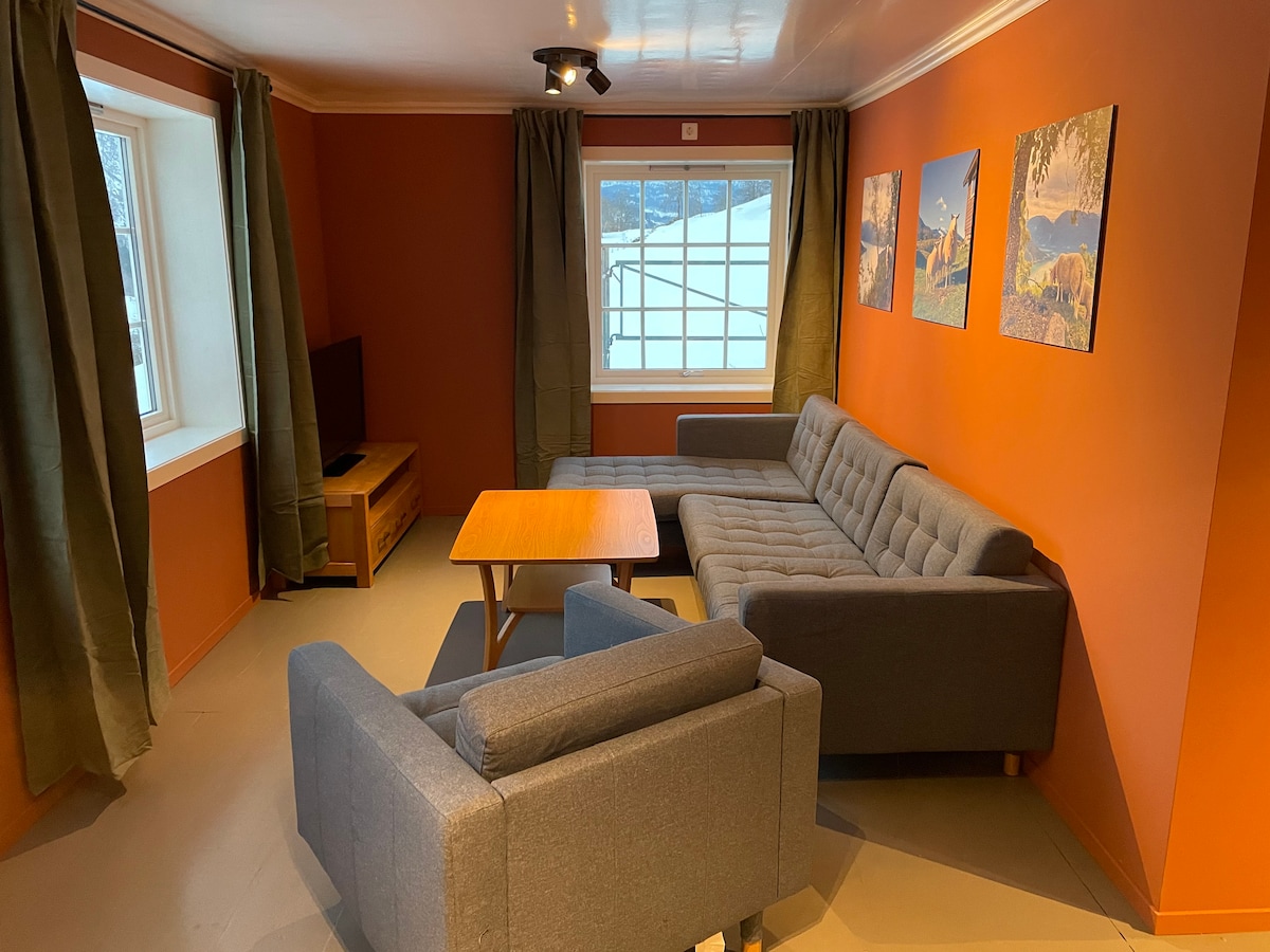 Email: info@klokkargarden.se Ang lumang bahagi ng bahay ay itinayo noong 1947 at kami na ngayon ang ika -4 at ika -5 henerasyon na naninirahan dito. Palagi itong paboritong lugar ni Marit at lumalaki rin ito sa Espen. Ang bagong bahagi ng bahay kung saan mo makikita ang iyong flat ay natapos noong 2018. Ang panlabas na lugar ay "work in progress" pa rin - ngunit iangat ang iyong mga mata at makikita mo ang kagandahan ng Aurlandsfjord. Ang flat ay angkop para sa 2 -3 may sapat na gulang o 2 may sapat na gulang kasama ang 2 bata.