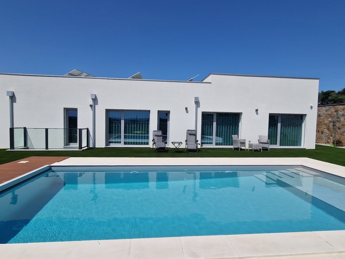 Country House, modernong estilo na matatagpuan sa isang napaka - kalmado na lugar at may mahusay na access. May tatlong double bedroom at sapat na espasyo na may 2+ 3 pang - isahang kama. Tatlong banyo, isa sa mga ito ay pribado, kusinang kumpleto sa kagamitan, malaking silid - kainan, malaking TV na may flat screen, mga sofa, na napapalawak na hapag - kainan. Air Conditioner at Mainit na Tubig sa pamamagitan ng Solar Panel. BBQ grill. Garahe para sa anim na sasakyan. Mga berdeng espasyo. Malugod na tinatanggap ang lahat. Salamat sa iyong preperensiya.