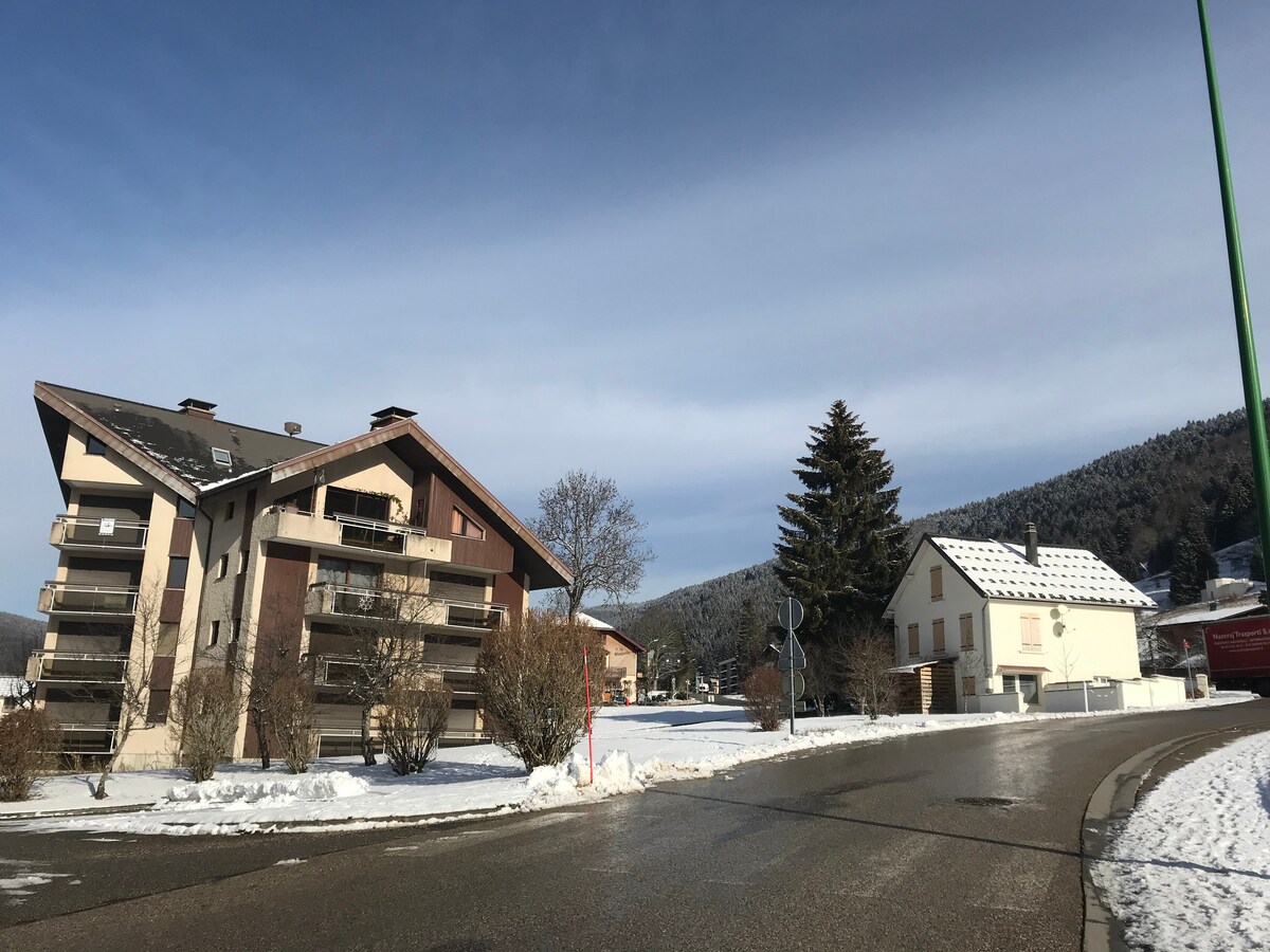 Sa gitna ng resort ng Monts Jura sa isang tipikal na nayon ng Jura, isang maaliwalas na cocoon ang naghihintay sa iyo. Sa altitude na 950 m kung saan malalanghap mo ang malinis na hangin ng magagandang pag - alis sa paglalakad ang naghihintay sa iyo 29 m2 apartment na may balkonahe na may mga kahanga - hangang tanawin ng bundok, 2 maliit na hiwalay na silid - tulugan, kitchenette living room. Ang kitchenette na kumpleto sa kagamitan pati na rin ang fondue , raclette at crêpière machine. Flat - screen TV, DVD player at mga board game. Banyo na may bathtub at hiwalay na toilet. Pribadong paradahan