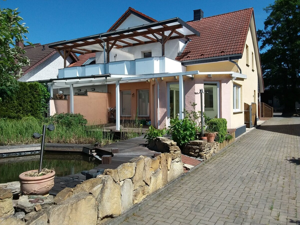 Matatagpuan ang aming maganda at maliwanag na apartment sa gitna ng mga parang at bukid sa Vlotho - Wehrendorf. Napapalibutan ng maraming hayop at kalikasan, maaari mong kalimutan ang tungkol sa pang - araw - araw na buhay dito. Inaanyayahan ka ng malaking hardin na magtagal. Pero puwede ka ring makahanap ng magagandang destinasyon sa pamamasyal sa agarang paligid. Dahil sa mahusay na mga koneksyon sa transportasyon, ang apartment na ito ay partikular na angkop para sa mga bisita sa trade fair, mga taong pangnegosyo, mga fitter o motorcyclist sa isang malaking paglilibot.