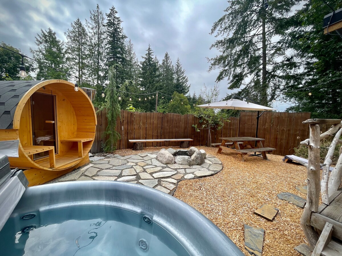 Welcome to Storybook Tiny home in serene Sequim, a cozy forest haven, featuring charming craftsman woodwork, a queen bed, a private bathroom with a new flushable toilet, a kitchenette with a microwave, and a propane fireplace for a snug atmosphere. Enjoy the outdoor patio with a firepit, relax in the 104 degree hot tub. Observe local wildlife. Just a short drive to Sequim's shops,hiking trails and near Olympic National Park, the perfect blend of rustic charm and convenience for your getaway.
