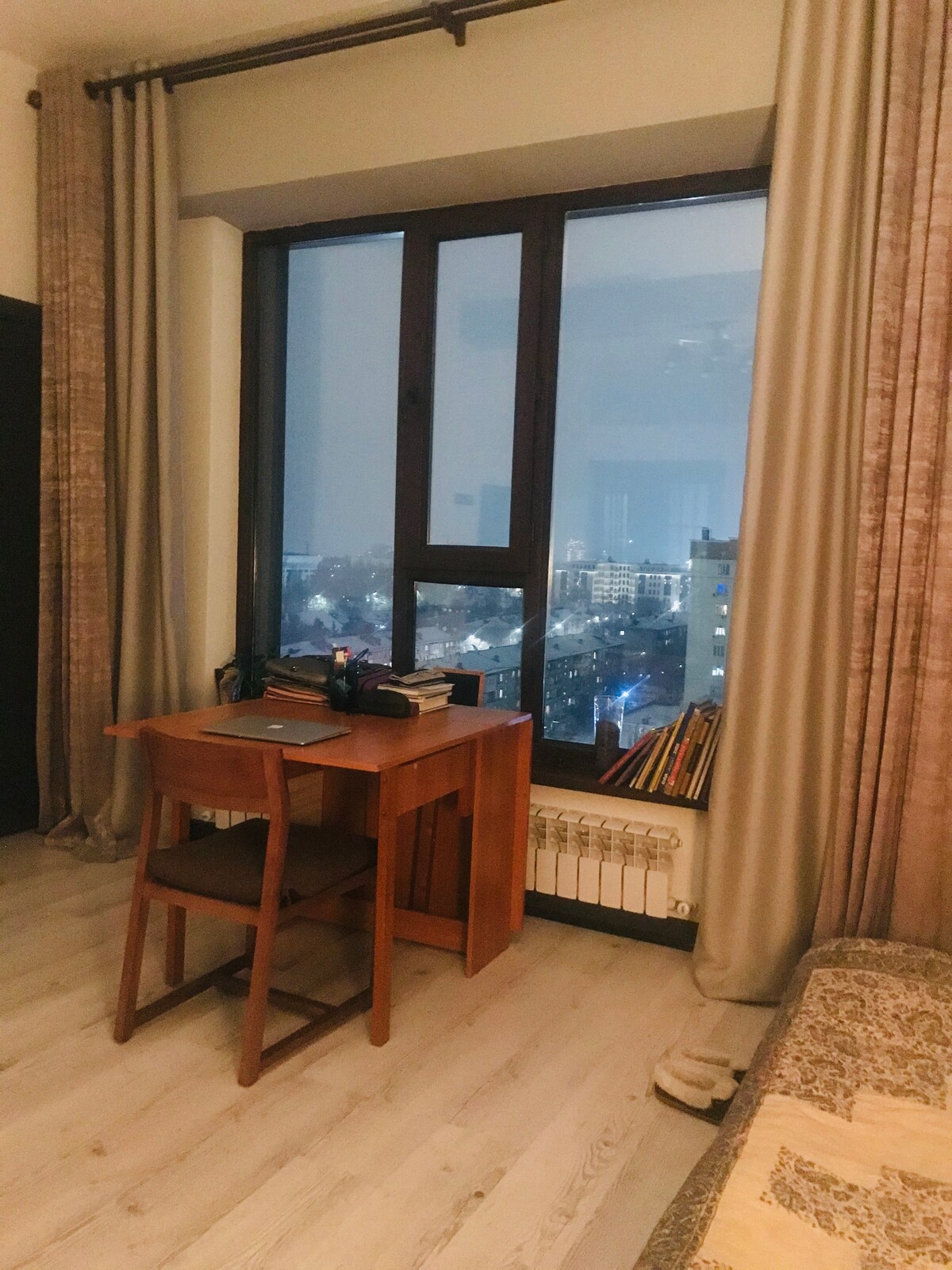 Ang aming apartment ay nasa Centre of Bishkek, bagong gusali, sa 12 palapag. Tanawin mula sa bintana, kung saan makikita mo ang mga bundok, paglubog ng araw at pagsikat ng araw. Malapit sa iyo, makakahanap ka ng mga tindahan, sinehan, cafe, unibersidad. Madali lang makahuli ng transportasyon. May 3 kuwarto, 2 banyo, balkonahe, at bintana na malapit sa sahig. Winter time sa apartment napaka - init, oras ng tag - init mayroon kaming 2 conditioner. Maligayang pagdating sa aming mapagpatuloy na apartment. Ito ay Joy para sa amin upang makatulong sa iyo tungkol sa Bishkek at Kyrgyzstan)