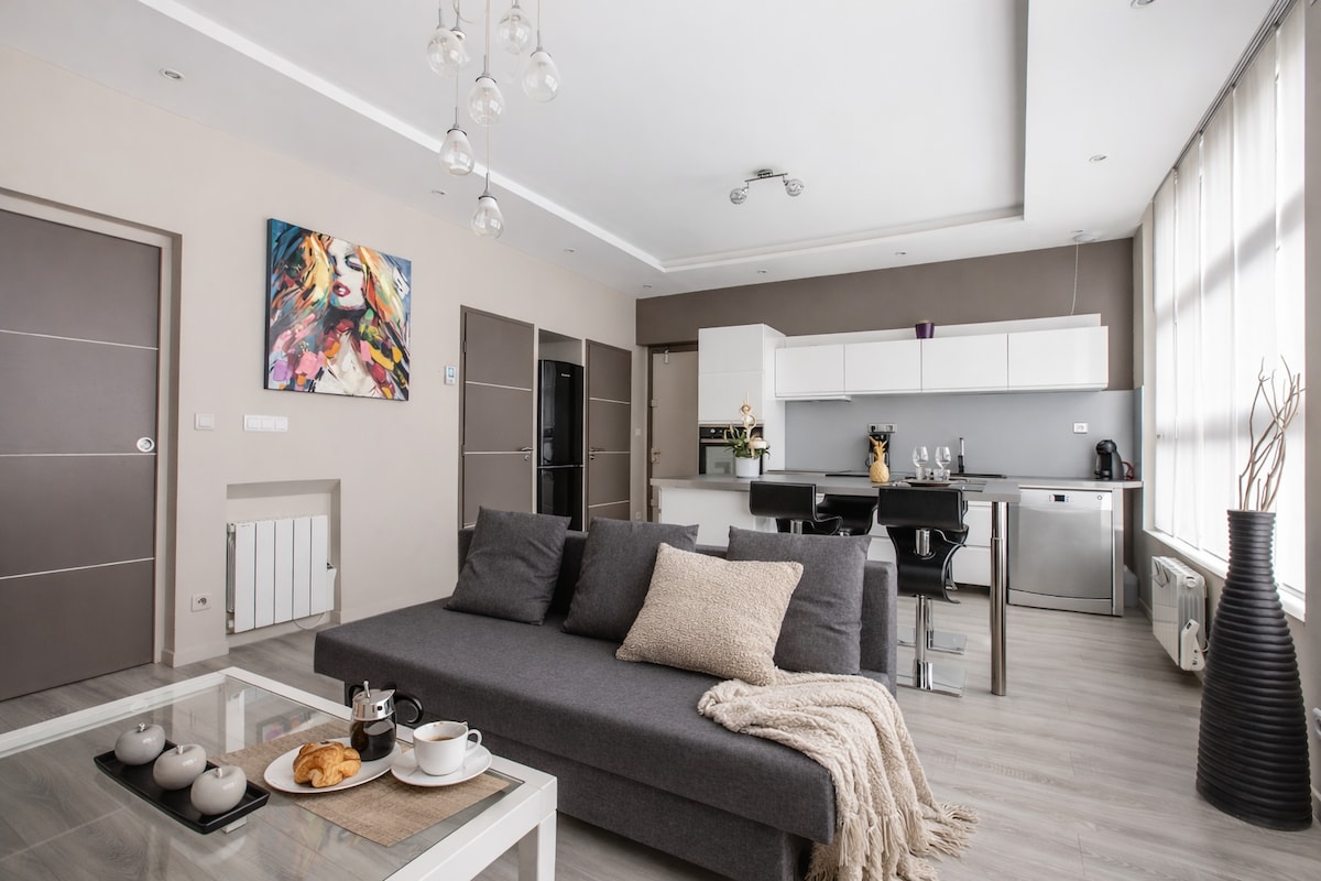 Magandang TULUYAN * HYPER - CITY CENTER* sa magandang ligtas at tahimik na tirahan, 8 minutong lakad mula sa istasyon ng tren, 90 metro mula sa * * MAGAGANDANG LUGAR * * LIGTAS NA PARADAHAN ** para sa iyong kotse, utility, van, motorsiklo at **MAGANDANG TERRACE ** na nagbibigay ng magandang tanawin ng** Belfry of Arras**. Sofa bed para sa 2 bata o isang may sapat na gulang,, kuwarto, kusina, coffee machine,banyo na may bathtub, independiyenteng toilet,ang mga susi ay ibinibigay ng host..nang may kasiyahan na tanggapin ka