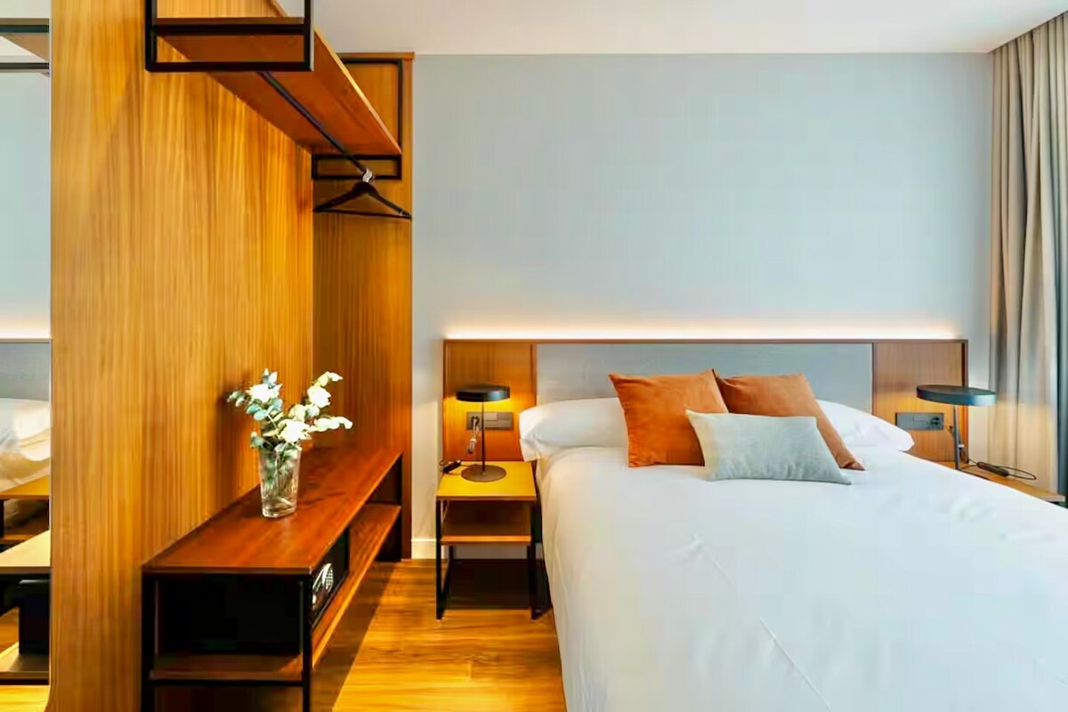 Ang aming mga studio na may double bed, ay may sukat na tinatayang 22 m2 at may mga tanawin ng interior patio o lungsod. Ang lugar sa kusina ay may coffee maker, toaster, microwave na may Grill, refrigerator o refrigerator, hob at mga pangunahing kagamitan. May shower at hairdryer ang banyo. Nakumpleto nila ang kanilang mga flat - screen TV facility, libreng wifi, kama na 150 x 200 cm. Ang iba 't ibang uri ng dekorasyon nito (functional, Mediterranean o sopistikado) ay lumilikha ng moderno at komportableng estilo sa mga kuwarto.