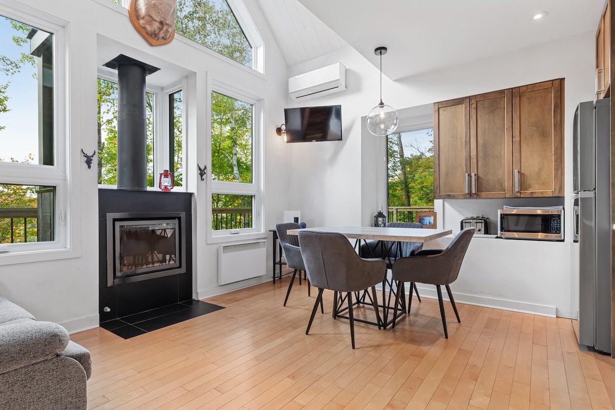 Ang aming Nordic forest chalet ay perpekto para sa paggugol ng kalidad ng oras bilang mag - asawa (o kasama ang isang bata), o para sa isang work - retreat (na may high - speed WiFi). Mainit at komportable ang interior na gawa sa kahoy. Nag - aalok ang mga bintanang may buong taas ng mga nakamamanghang tanawin sa lambak ng kagubatan. Pinapanatili ka ng open - concept na kusina at sala sa pag - uusap habang nagluluto. Kung mas gusto mong magluto sa labas, may fire pit na may grill at outdoor dining table. 70 minutong biyahe lang mula sa Montreal. 25 minutong lakad ang lawa kung magpaparada ka sa malapit.