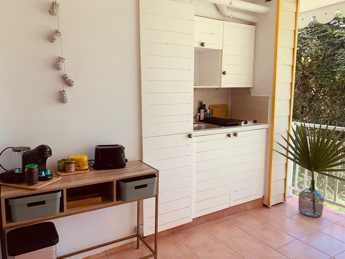 Ituring ang iyong sarili sa isang hindi malilimutang bakasyunan sa Guadeloupe sa isang komportableng tuluyan sa isang bakasyunang nayon sa tabing - dagat na may mga swimming pool at beach. Nag - aalok ang kaakit - akit na studio na ito, na matatagpuan sa ika -1 palapag, ng kakaibang tanawin ng mga tropikal na halaman na may tanawin ng dagat, para sa mga sandali ng pagrerelaks at katahimikan. Tumatanggap ng hanggang 4 na tao, ang Ti Kaz Doudou ay binubuo ng isang naka - air condition na silid - tulugan na may double bed at trundle bed, TV at wifi, banyo at terrace na may kagamitan sa kusina at dining area.