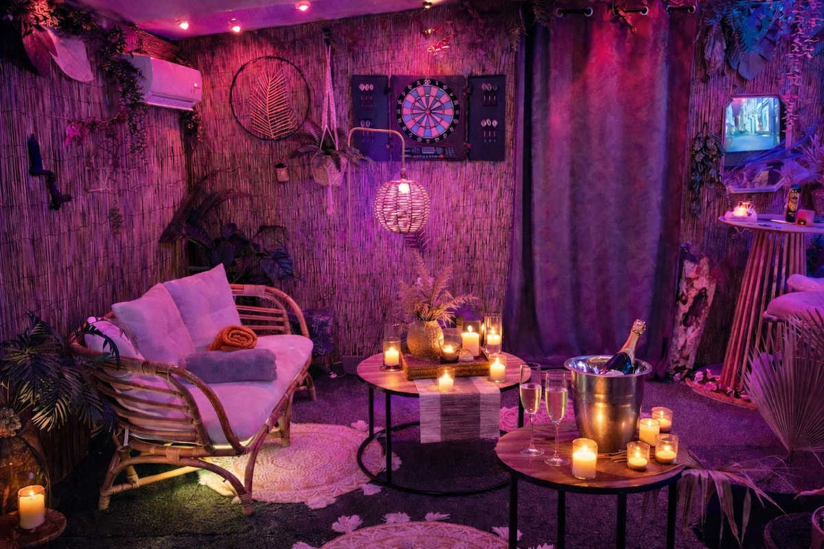 ✨ Découvrez le Mirage Tropical , une parenthèse raffinée au bord de la Loire 🌴. Profitez d’un Spa , Table de Massage d’une terrasse élégante et d’un espace jungle dépaysant pour vous évader. Amusez-vous autour du jeu de fléchettes, partagez un apéro exotique ou détendez-vous dans une atmosphère unique. Le soir venu, la chambre s’illumine de couleurs envoûtantes pour un moment chic et romantique 💖. Ici, chaque détail sublime votre séjour pour créer des souvenirs mémorables.🌴❤️❤️💕💕💕👄🫂❤️