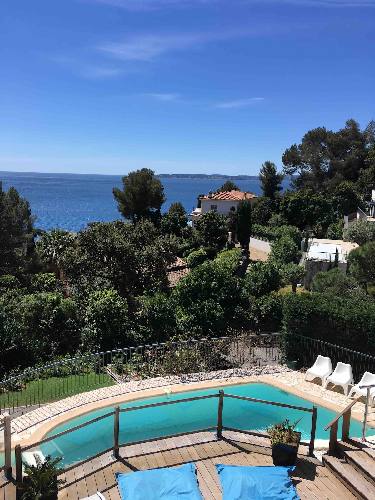 Maligayang pagdating sa magandang villa na ito (inuri ang 4 na star)! Mapapahalagahan mo ang nakamamanghang tanawin ng Dagat Mediteraneo, na namamalagi sa hardin, o sa mga terrace, o mula sa sala, kusina, o mga silid - tulugan ... Matatagpuan ang villa (150 m2, plot na 1000 m2) sa TAHIMIK na kapitbahayan, na nakaharap sa timog/silangan, malapit sa mga beach at iba pang serbisyo. Nagbubukas ang silid - kainan sa isang malaking terrace na may mesa, barbecue, at pribadong swimming pool. Hiwalay na babayaran sa site ang matutuluyang linen.