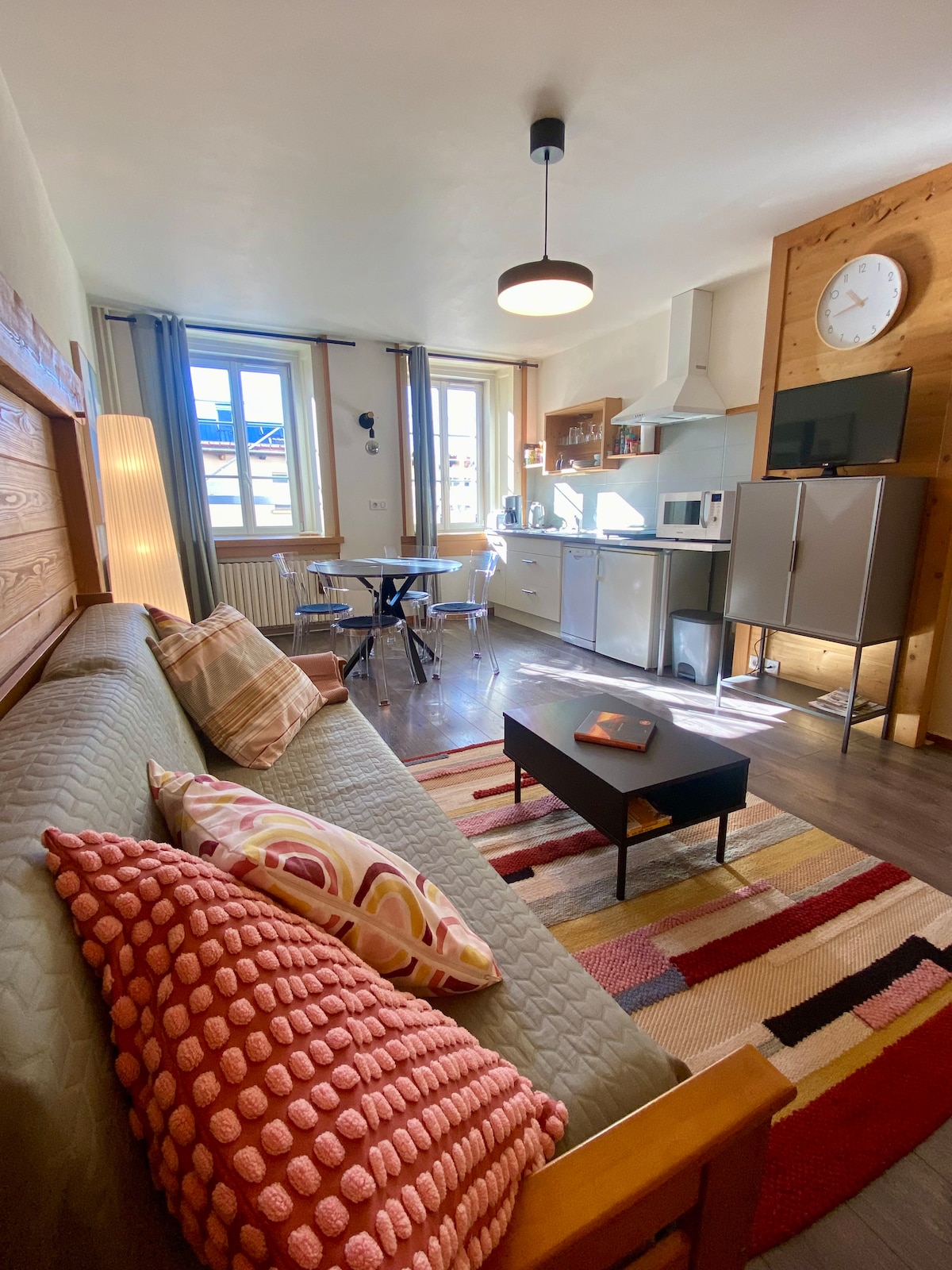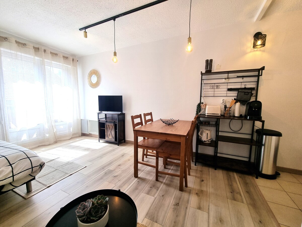 Maliwanag na 24 m² studio sa unang palapag, na may perpektong lokasyon: mga tindahan, supermarket, panaderya, labahan at istasyon ng gas na malapit sa, sentro ng lungsod na may maigsing distansya sa loob ng 10 minuto. Sa taglamig: Wala pang 300 metro ang layo: libreng ski - bus stop na may ski pass, Risoux Forest: hiking, snowshoeing Tag - init: Mga hiking trail sa kagubatan ng Risoux. Lac des Rousses: mga pedal boat, pinangangasiwaang paglangoy Perpekto para sa praktikal at nakakarelaks na pamamalagi sa gitna ng kalikasan at lahat ng amenidad!