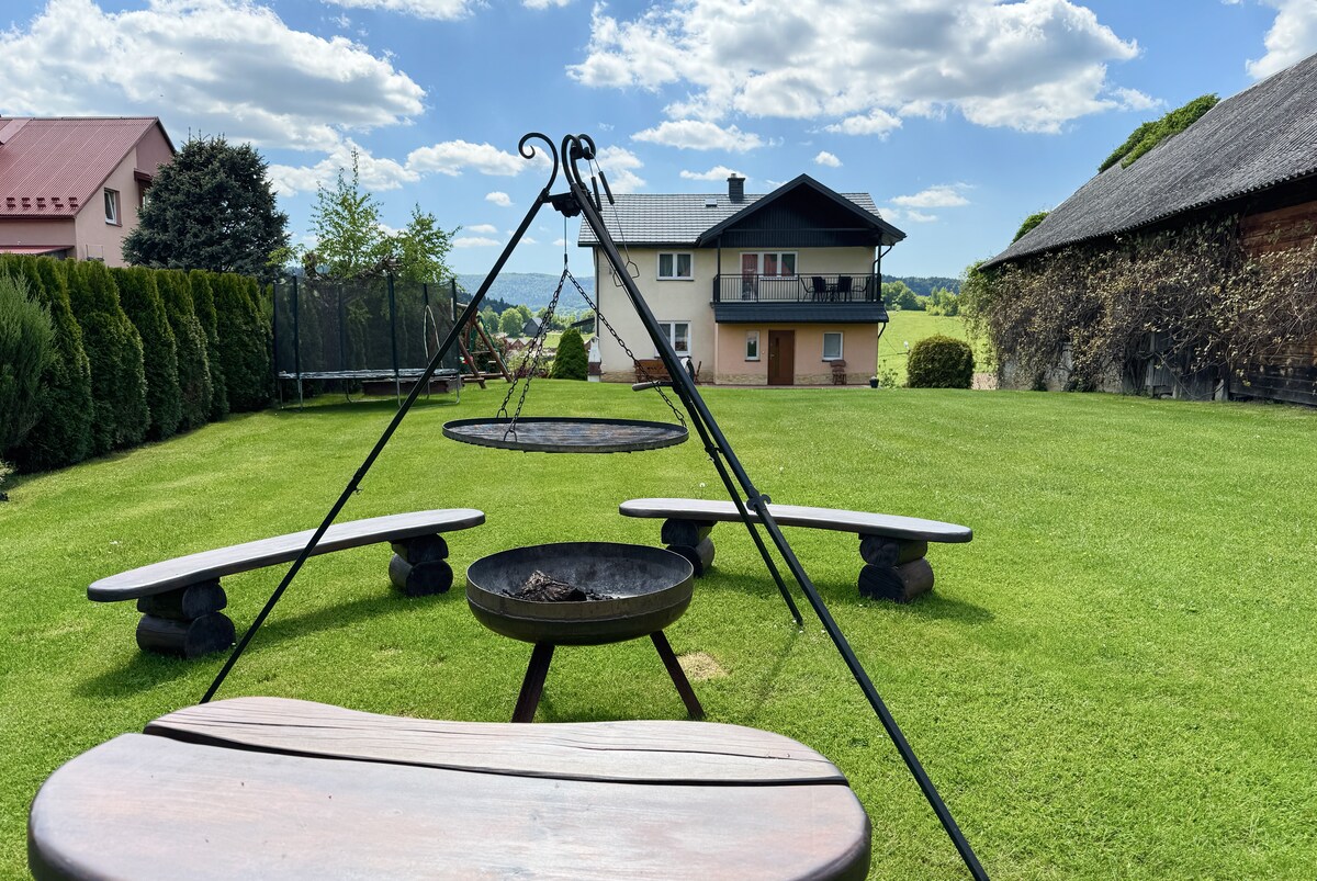 Inaanyayahan ka naming mag - book ng natatanging pampamilyang tuluyan na matatagpuan sa gitna ng Bieszczady Mountains, na napapalibutan ng kalikasan, katahimikan at magagandang tanawin ng bundok. Maluwag at komportable ang tuluyan. Mayroon itong dalawang banyo, 4 na silid - tulugan, malaking sala, malaking kusina, balkonahe, at patyo. Sa harap ng bahay ay may palaruan para sa mga bata (sandpit, swings, trampoline). Matatagpuan ang bahay mga 200 metro mula sa Lake Solinski. May mga hot tub sa property nang may karagdagang bayarin.