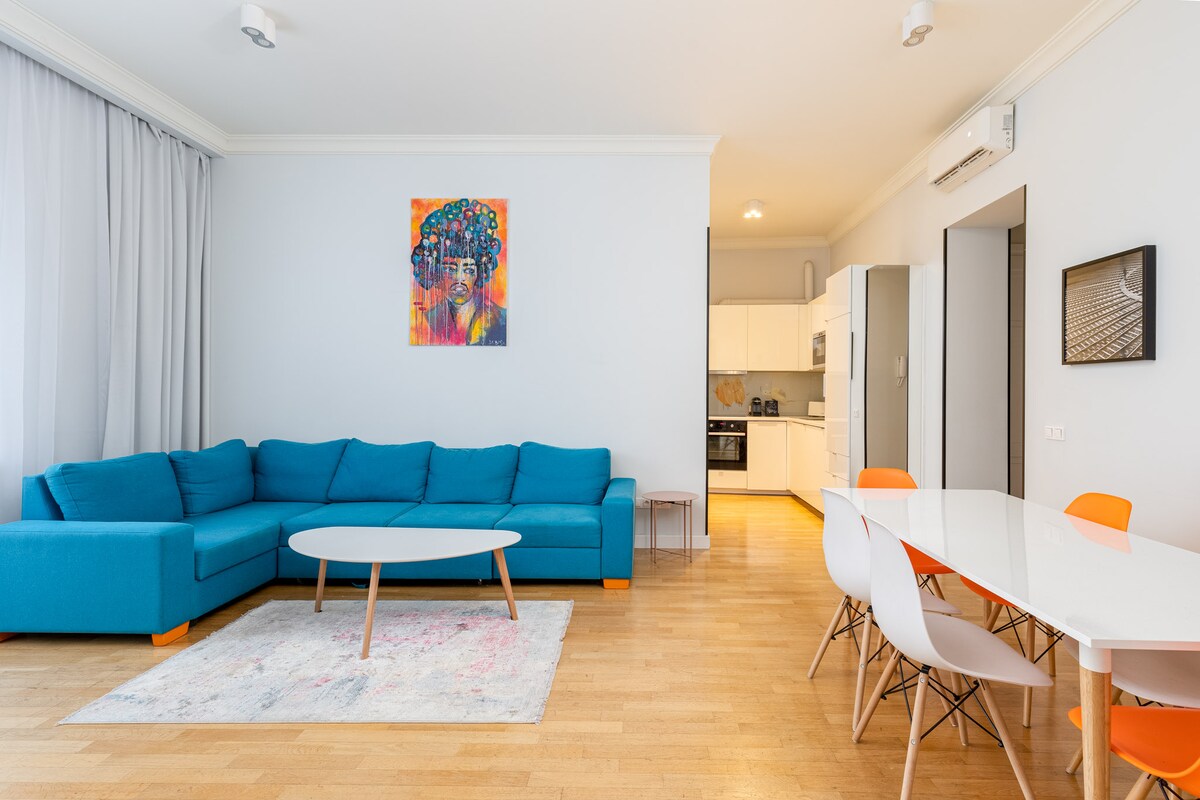 Centrally located classic vintage design apartment situated on the second floor of a historic tenement house with street and courtyard view, living room, fully equipped kitchen, dining space, large private bathroom, two quiet bedrooms, each furnished with a comfortable double bed. Air conditioning, heating, Netflix, WiFi, washer dryer and other amenities provided for a short term or long term stay in Krakow.