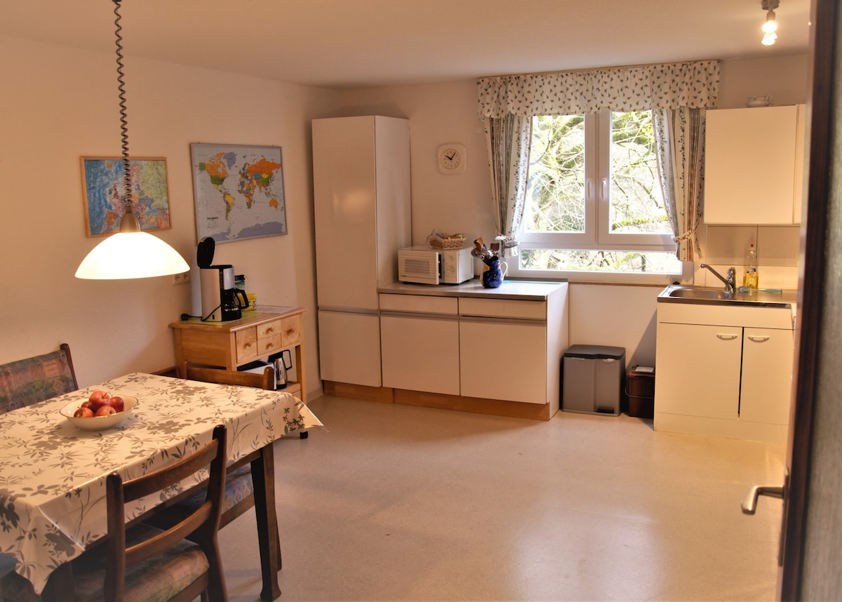 Maligayang pagdating! Malugod na inihanda para sa iyo at may kamangha - manghang tanawin sa Winnenden, nais namin sa iyo na maaari kang magpahinga at sa gayon ay matugunan ang iyong pang - araw - araw na buhay na may bagong lakas. Ang 2 - room apartment ay may ganap na bagong kagamitan sa kusina, TV, WiFi, komportableng king size bed na may zone mattress, 140cm ang lapad na sofa bed at dalawang maliit na mesa. 10 minutong lakad ang layo ng pedestrian area ng lumang bayan na may iba 't ibang shopping facility.