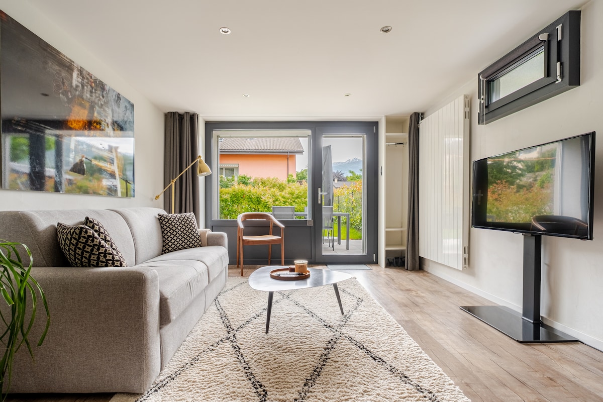Villa design + malaking jacuzzi + tanawin ng Alps at mga ubasan