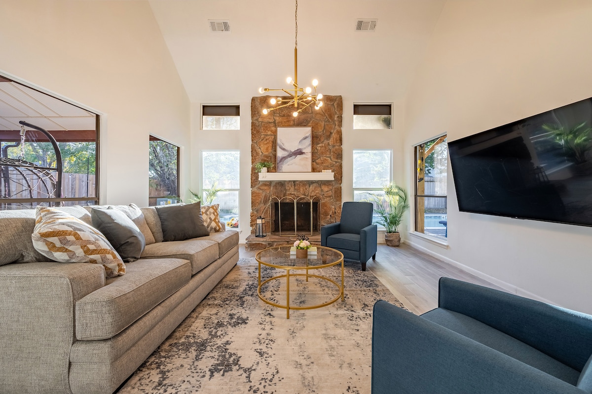 Welcome sa pribadong bakasyunan sa tabi ng lawa sa Humble, TX—isang tahimik at modernong farmhouse na retreat sa dulo ng tahimik na cul-de-sac na napapalibutan ng matataas na puno, kanta ng ibon, at nakakarelaks na likas na kapaligiran. Perpekto para sa mga mahilig sa kalikasan, pagsasama‑sama ng pamilya, staycation, at bakasyon sa katapusan ng linggo. ★ Pool at mga Float ★ Hot Tub ★ Malaking Bakuran na Puno ng Damo at mga Laro ★ Gazebo na may Muwebles at Kainan ★ Fire Pit ★ Mga lounge chair para sa pag-aalinsunod sa araw ★ Outdoor Grill ★ Panloob na libangan at mga board game Kusina ★ na Kumpleto ang Kagamitan