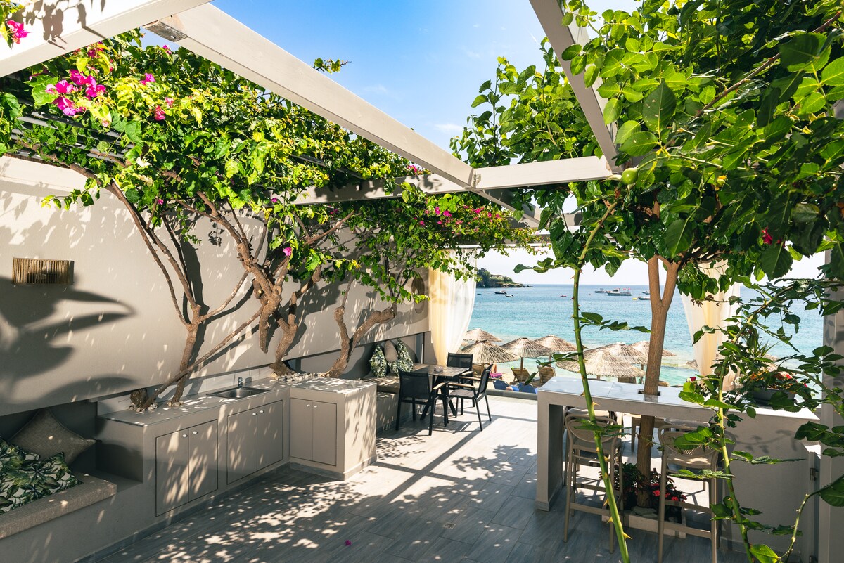 Mag‑escaping sa paraiso sa lupa na nasa harap mismo ng beach ng Agia Pelagia na may magagandang turkisong tubig. Ang Buganvilla Sea Front Villa Nerina ay isang kahanga-hanga, bagong itinayong pribadong villa na bahagi ng complex na may 4 na tirahan. Dahil sa pribilehiyong lokasyon, nakamamanghang tanawin, at de-kalidad na pasilidad na may lahat ng kaginhawaan, magkakaroon ka ng mga sandali ng ganap na pagrerelaks kasama ang mga mahal mo sa buhay na hindi mo malilimutan habambuhay.