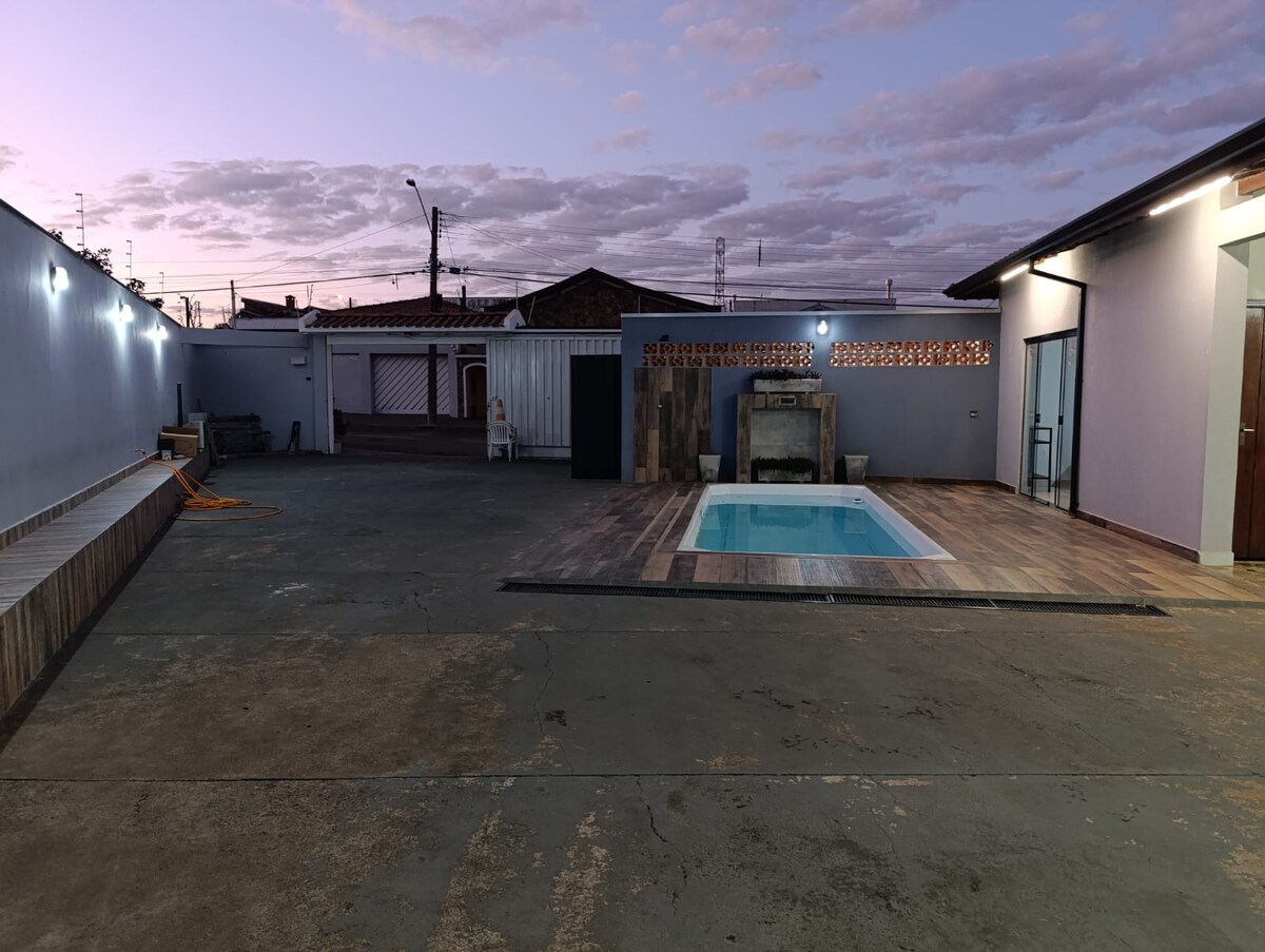 Maganda at modernong bahay, na matatagpuan sa isang tahimik at ligtas na kapitbahayan sa loob ng lungsod ng Americana, na matatagpuan 131 km mula sa SP. Isipin ang iyong pamamalagi sa magandang lokasyon, na may magandang swimming pool, at magandang lugar para magrelaks. Perpektong bakasyunan ito para sa pamilya at mga kaibigan. Walang pananggalang na rehas sa pool. Malaking bahay na may barbecue, at may takip na lugar na may bentilador. May 2 kuwarto, banyo, sala, at kusina na pinagsama-sama sa loob ng bahay. Home Office na may 125 megas