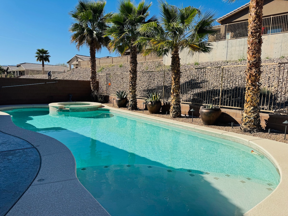 Enjoy this "home away from home" in a quiet and beautiful neighborhood. The home comes with a fully equipped kitchen, 3 bedrooms - 2 rooms are furnished with a queen bed and the master suite hosts a king size bed, 2 full bathrooms, 4 smart TV's, and washer and dryer. Backyard has a large hot tub and a *heated pool. There is plenty of room to relax, grill, and watch your favorite sports game. *** there is a 100$ per day additional charge to have the pool heated. Business license #991430