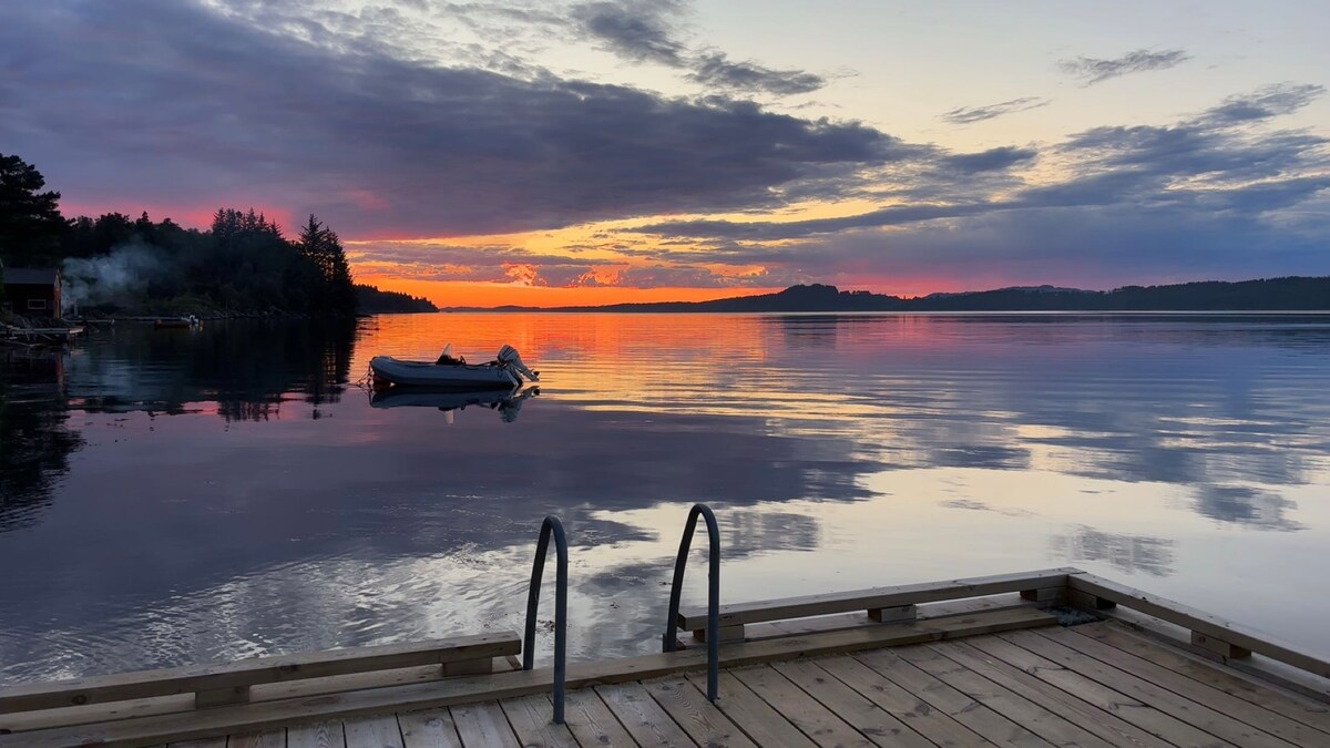 Bagong cabin sa tabi mismo ng fjord. Idinisenyo gamit ang 200 taong gulang na recycled na kahoy mula sa isang kamalig, na nagpapakita ng magandang tanawin ng fjord. Ginawa nang may pagmamahal at paggalang sa mga tradisyon at kagandahan ng kalikasan ang bawat detalye. Mga de‑kalidad na brand ang mga muwebles at puwede ring gamitin sa labas sa terrace. Makakagamit ka ng mga kayak at kanue, at may pinaghahatiang lugar sa tabi ng dagat na may firepit at lumang boathouse na may munting terrace kung saan puwede kang umupo nang may bubong. Maikling lakad lang ang layo ng cabin.