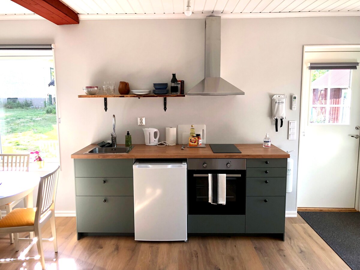 Guest house na may covered terrace. Sa parehong kuwarto, may magandang kama para sa apat na tao na nahahati sa isang double bed at isang sofa bed. May mga kobre-kama at mga tuwalya. May shower at toilet. May kusina na may kalan, refrigerator na may freezer, coffee maker, kettle at microwave. Broadband na may wifi. TV na may Chromecast. May washing machine sa ibang gusali. May charging box para sa electric car. May parking space din para sa mas malalaking sasakyan. Tatanggapin ka namin sa iyong pagdating, o maaari kang mag-check in nang mag-isa gamit ang key cabinet. Welcome! Lennart at Annika