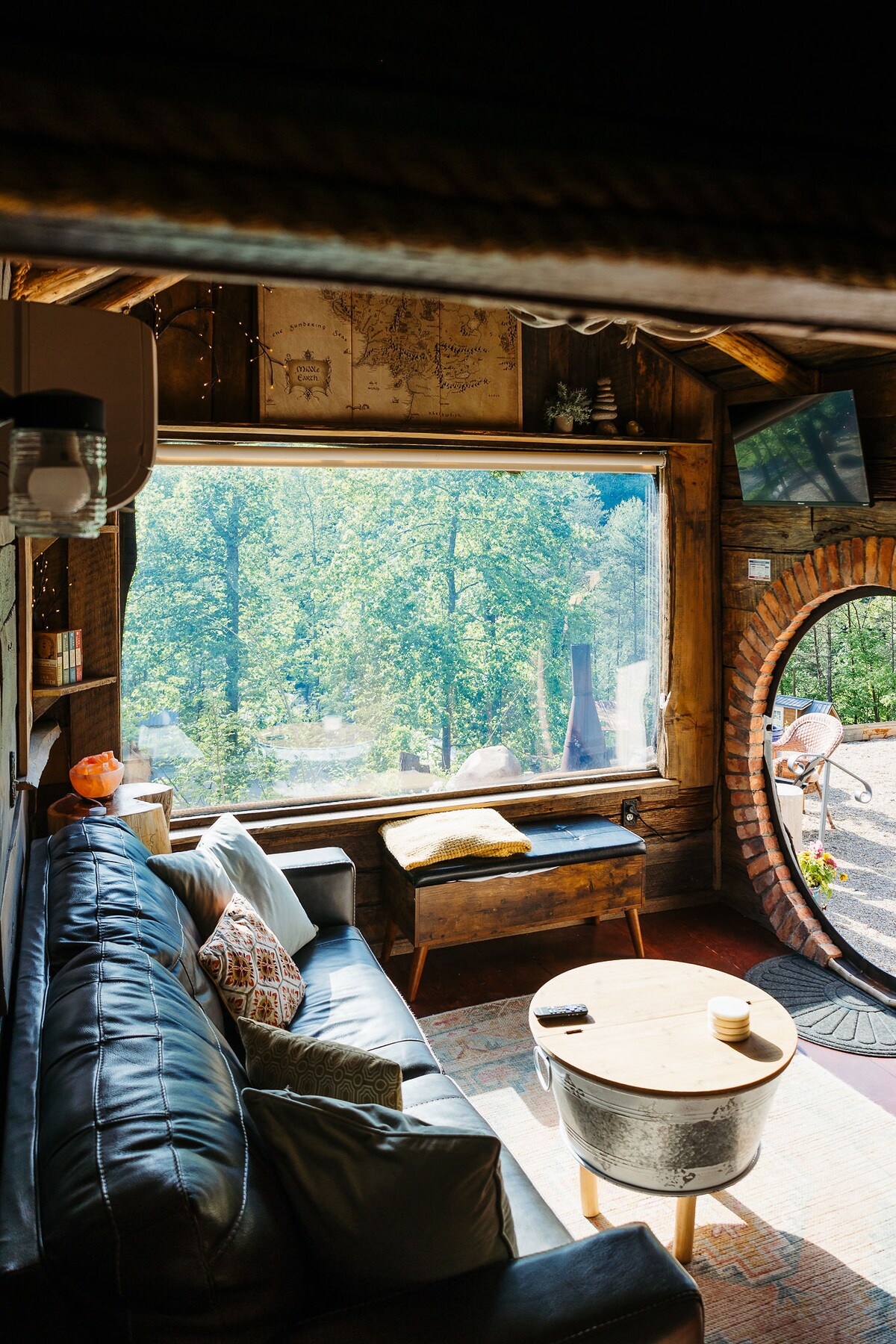 Escape to a Shire-inspired Cozy Tiny House (#1) at Mountain Shire (find us on Insta (IG) @mountainshire), located minutes from Pigeon Forge, Gatlinburg, and the Great Smoky Mountains National Park. This 200 sqft retreat features a loft with a queen bed, a living room with a sofa bed and Roku TV, a kitchenette, and a bathroom with a shower. Enjoy outdoor amenities like a chiminea, lounge chairs, picnic tables, shared BBQ grill, patios, decks and more! Other houses are on the property.