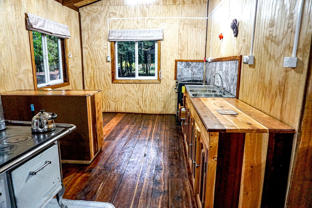 Ito ay isang rustic na Tiny house type cabin (maliit na cabin) sustainable para sa 2 tao. NAPAKAHALAGA : Wala itong TV. Mayroon itong maliit na minibar, hair dryer. Mayroon itong wood - burning kitchen at mainit na malamig na aircon. Mayroon itong hot tub na may dagdag na halaga na $ 40,000 piso. Napapalibutan ng mga katutubong puno, itinayo ito at sinusubukang panatilihin ang balanse sa paligid. May fire pit sa labas. Isa 't kalahating kilometro ang layo ay ang bayan ng Rio Puelo at 3 kilometro mula sa Termas del Sol