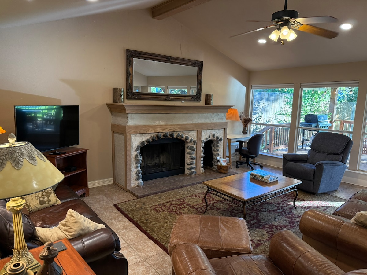 The Texas Cabin sleeps 7, is a 1 bedroom king with a dormer w/ twin and queen bunks, Pool table and big screen tV . fully equipped out door kitchen , Lg back yard w/ lake view and a large ready to light fire 🔥 pit! Private tropical 🌴 pool to our 3 rentals ( may be shared) Lake access. The amenities include 1 double kayak , 4 single kayaks, and 1 paddle boards. Life vest provided. A pop up tent, lake chairs amd limited fishing equipment. Centrally located to many restaurants,wineries.