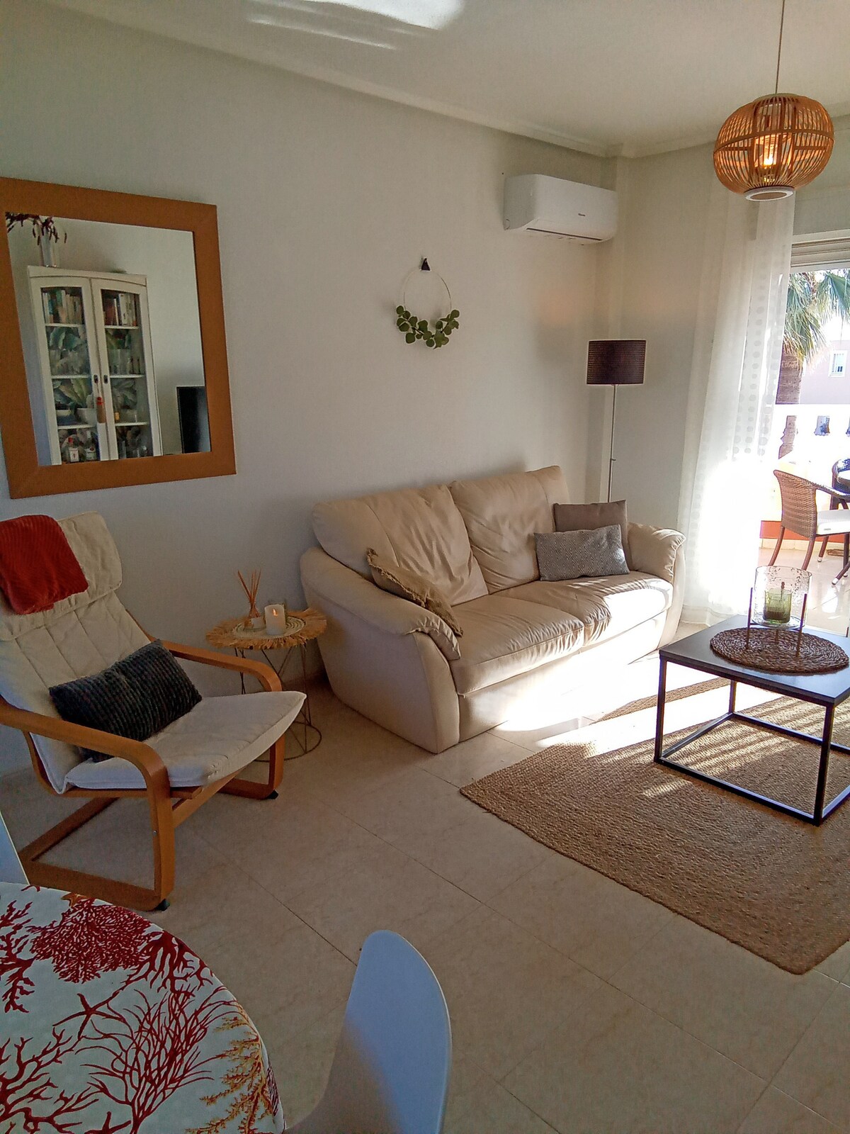 Bungalow for rent on the ground floor in a gated complex with 2 swimming pools in Ciudad Quesada. The total area is 85 m2, consists of 2 bedrooms, a spacious living room, a kitchen, two bathrooms, 2 terraces. There is a parking space. The apartment has everything you need for comfortable living and recreation: new furniture, household appliances (including a coffee maker, toaster, dishwasher), dishes, linens and towels. The apartment is equipped with air conditioning. SMART TV, WIFI