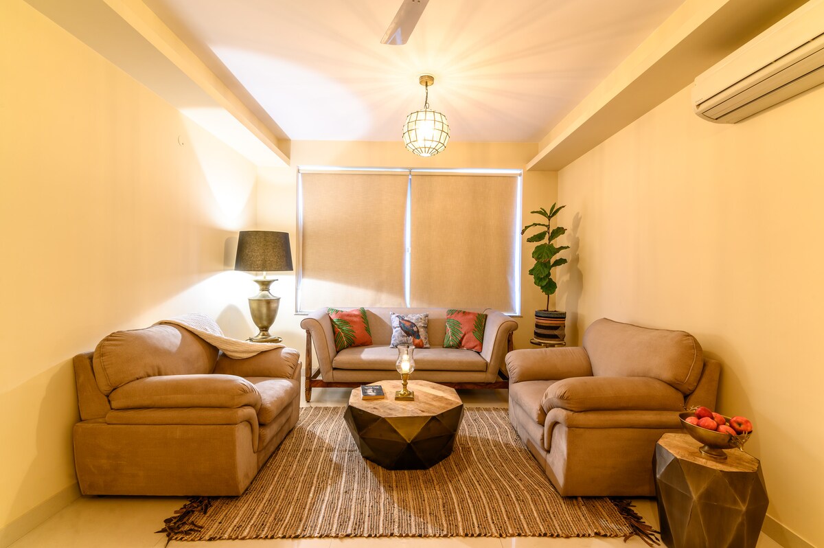 ➽ Maluwang na apartment na 1BHK na may nakakonektang patyo, na ganap na naka - air condition. May 1.5 toneladang AC ang lahat ng kuwarto. Pag ➽ - aari na nakaharap sa araw sa isang kapitbahayan na may mataas na kita, tatlong bahagi na bukas, nakaharap sa parke, at may sapat na natural na liwanag at sariwang hangin. ➽ High - end projector na may 25W soundbar at Amazon FireStick na may mga OTT app. Kumpletong kusina ➽ na may mga pangunahing kailangan para sa maginhawang pagluluto. ➽ Magrelaks sa nakamamanghang pribadong terrace patio na may mga ambient light at natatanging Foger system para sa paglamig sa patyo