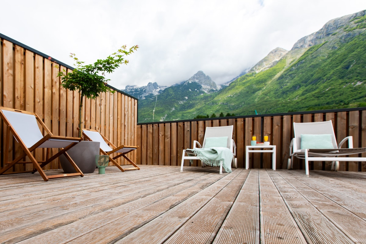 Matatagpuan sa tahimik na Soča River Valley, 300 metro lang ang layo mula sa ilog at 5 minuto lang mula sa masiglang tag - init ng Bovec, nag - aalok ang property na ito ng dalawang modernong nakakaengganyong apartment. Nagtatampok ang isa ng komportableng one - bedroom na may pribadong sauna, habang nag - aalok ang isa ng dalawang kuwarto; kumpleto ang kagamitan sa parehong apartment para sa kaginhawaan. Ang isang tended na hardin na may kusina sa tag - init at isang komunal na firepit ay nagbibigay ng perpektong lugar para magrelaks, na nag - aalok ng magagandang tanawin ng mga nakapaligid na bundok.