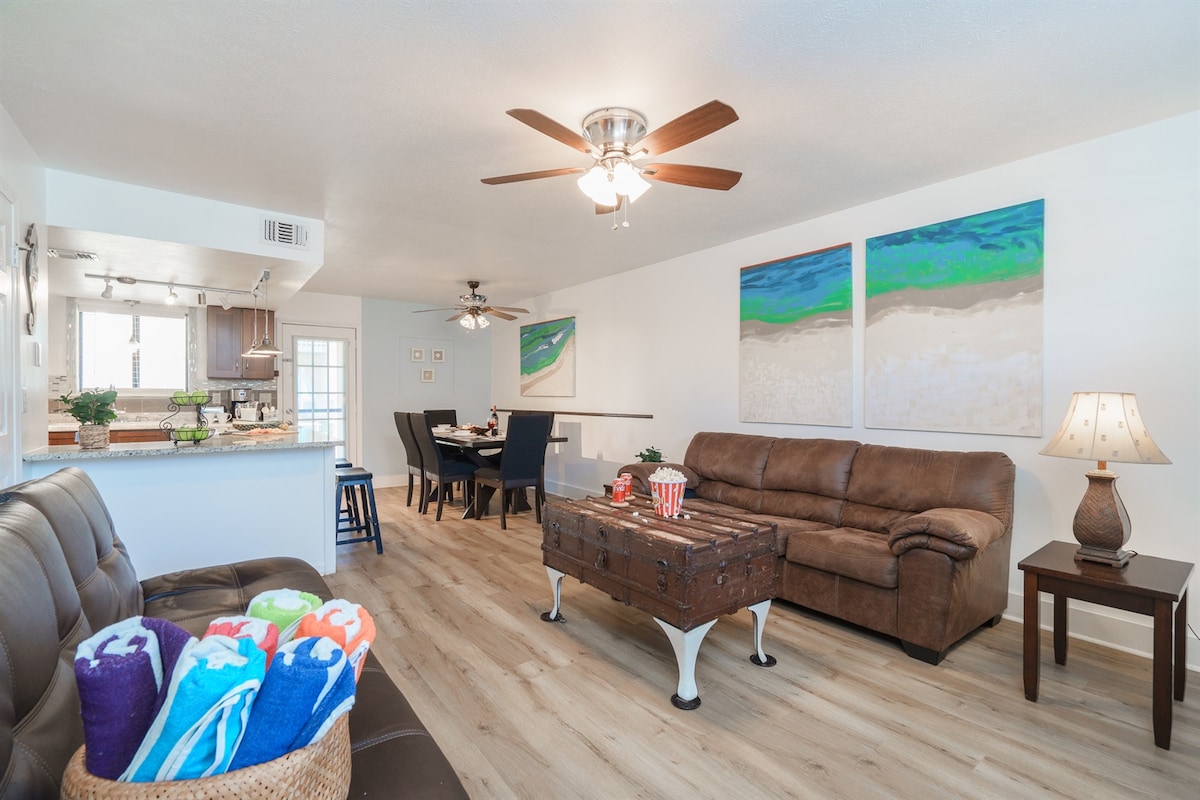 Maligayang pagdating sa townhouse na uri ng Beachy, Rustic, at Barn. Magrerelaks ka sa bago naming sectional na sala. Kumain sa isang rustic dining table na may apat na upuan. Ang apat na paikot - ikot na dumi sa tabi ng kusina ay gumagawa ng isang mahusay na breakfast bar o hangout area. BBQ at magrelaks sa patyo sa likod pagkatapos ng Beach. Puwedeng pakainin ng mga bata ang mga pagong at manghuli ng isda sa patyo. ROKU TV - Stick. NO - Cable service, kalahating banyo sa unang palapag. Sa hagdan, mayroon kaming labahan, 2 silid - tulugan w/1 king bed, 1 queen bed, 1 bunk bed