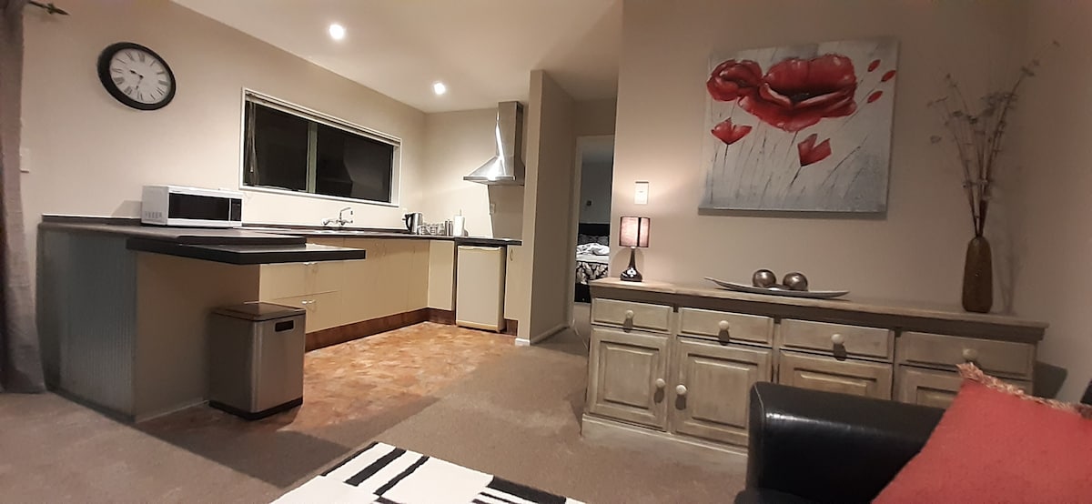 Maligayang Pagdating sa 'Resort'. Malapit lang kami sa Hawkes Bay expressway at limang minuto lang papunta sa mga gawaan ng alak, sa sentro ng lungsod, at ospital ng Hawkes Bay. Ang self contained na kuwarto ay may kumpletong kagamitan, pribadong entrada, at ligtas na paradahan sa labas ng kalsada. May hapag kainan, queen - sized na higaan, katad na couch at malaking flat screen TV sa sala. May kasamang wifi at access sa Netflix. Kasama sa kusina ang refrigerator, toaster, pitsel, kape, tsaa at asukal. May microwave at induction cooker.