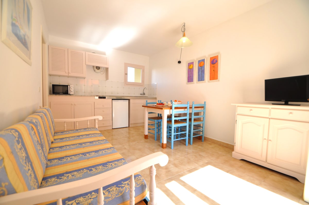 Matatagpuan ang aming apartment na may communal pool para sa 4 na tao sa isang tahimik na side street, 3 minutong lakad ang layo mula sa Calan Bosch marina. Sa loob ng humigit - kumulang 4 na minutong distansya, mararating mo ang beach Calan Bosch gamit ang puting pinong buhangin nito. Sa Cami de Cavalls, puwede mong marating ang Son Xoriguer beach sa loob ng 5 minuto.