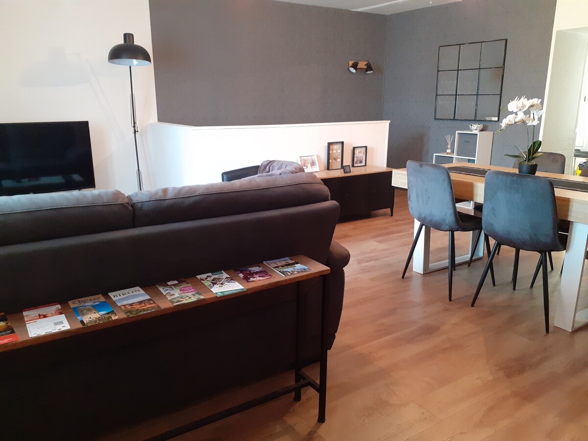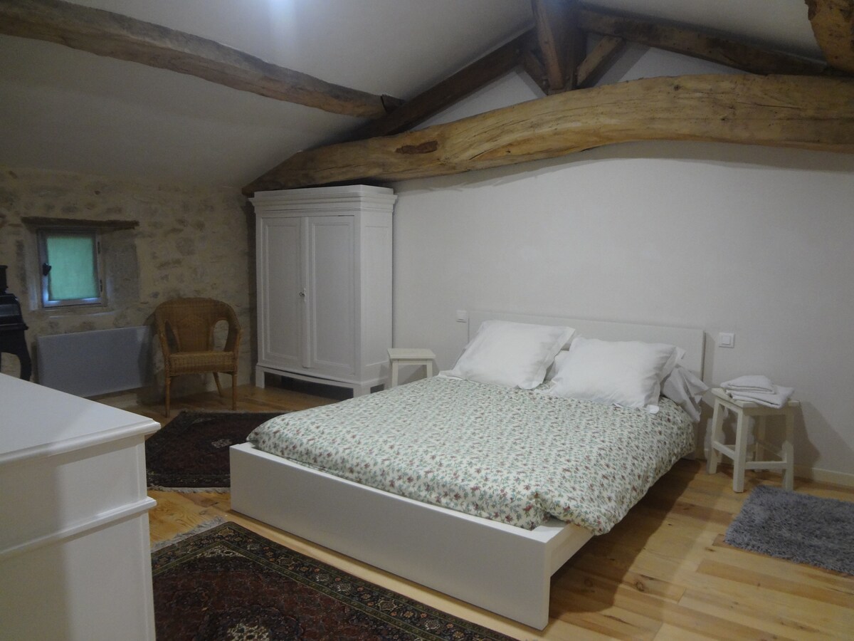 Welcome sa L'atelier d'André, isang naka-renovate na hiwalay na kuwarto sa property namin. 36 m2 na kuwarto na may queen size na higaang 160 x 200. Banyo na may shower at lababo. Hiwalay na toilet. Tassimo coffee maker, munting refrigerator at microwave. Pribadong terrace sa labas. May kasamang almusal at posibleng may mga table d'hôtes na pagkain (posible ang vegetarian). May pribadong Jacuzzi session na may dagdag na bayad. Posibilidad ng mga masahe ng propesyonal na tagapagbigay sa pamamagitan ng reserbasyon. Huwag mahiyang magtanong