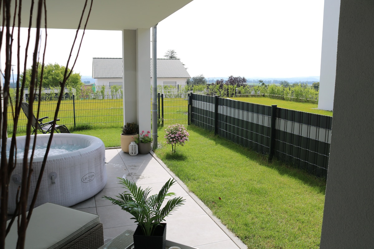 Pagbati at maligayang pagdating sa iyong marangyang pansamantalang tuluyan kung saan matatanaw ang kahanga - hangang Swiss Alps at pribadong hot tub! Ang maluwang na apartment na may 4 na kuwarto na 120 sqm sa maliit na distrito na "Lottstetten" ay nasa tinatawag na German Zipfel na napapalibutan ng mga hangganan ng Switzerland. Sa magiliw na apartment na may sariling upuan sa labas, puwede kang magpahinga at makaranas ng maraming nalalaman na oportunidad sa paglilibang bukod pa sa magandang kalikasan. Nasasabik na akong makita ka sa lalong madaling panahon!